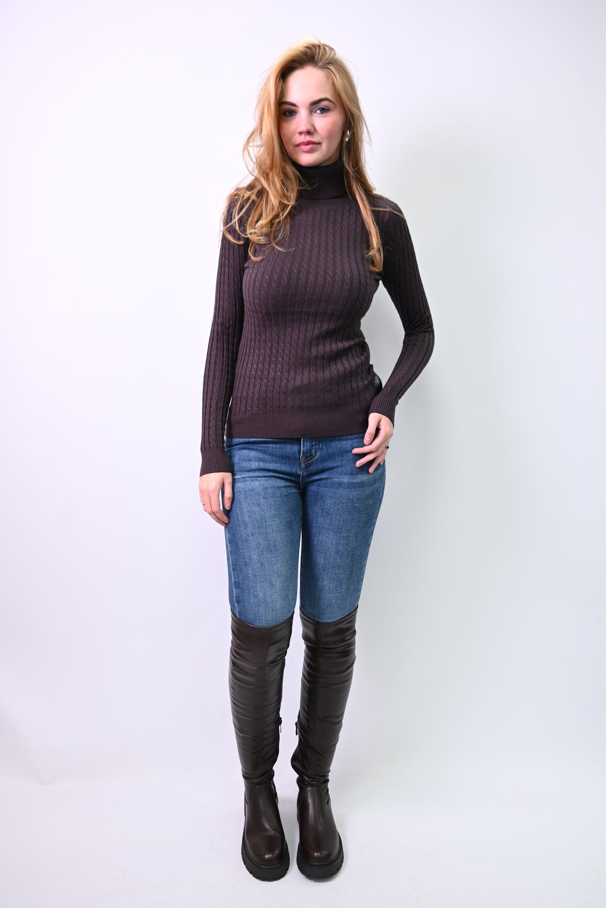 Een trui die fluistert in vezels. La Trame du Silence is een kabelgebreide coltrui in zachte beige tint, ontworpen als een cocon van rust. De hoge kraag omarmt de hals met warmte, terwijl het rijke breipatroon een subtiele diepte toevoegt aan het silhouet. Gecombineerd met glanzend donkerbruin leer ontstaat een contrast van texturen—zacht versus strak, stil versus krachtig. Draag het op dagen waarop je stijl wil voelen als een ademhaling: kalm, gelaagd, en moeiteloos elegant.