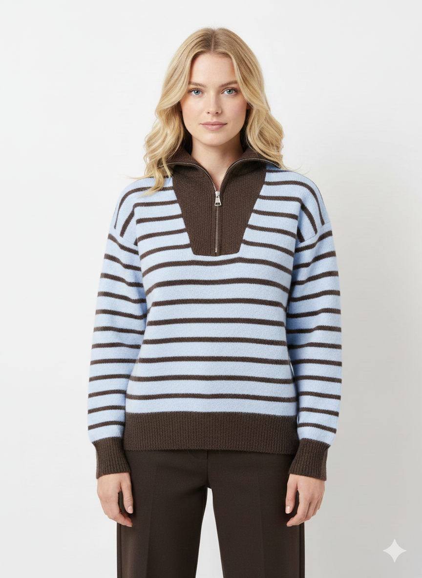 SEO NL: Lichtblauwe gestreepte trui met bruine halve rits