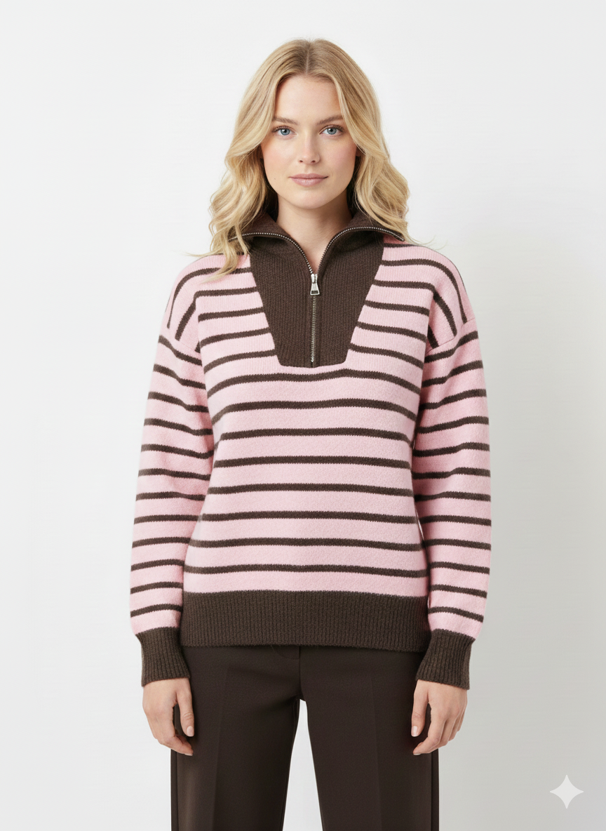 Een speelse cadans in knit. Rose de Rythme is een gestreepte trui in roze en bruin, met een solide borstpaneel en halve rits die structuur brengt in de zachtheid. De ribboorden accentueren het silhouet subtiel. Een trui voor dagen waarop kleur en comfort samen mogen dansen.