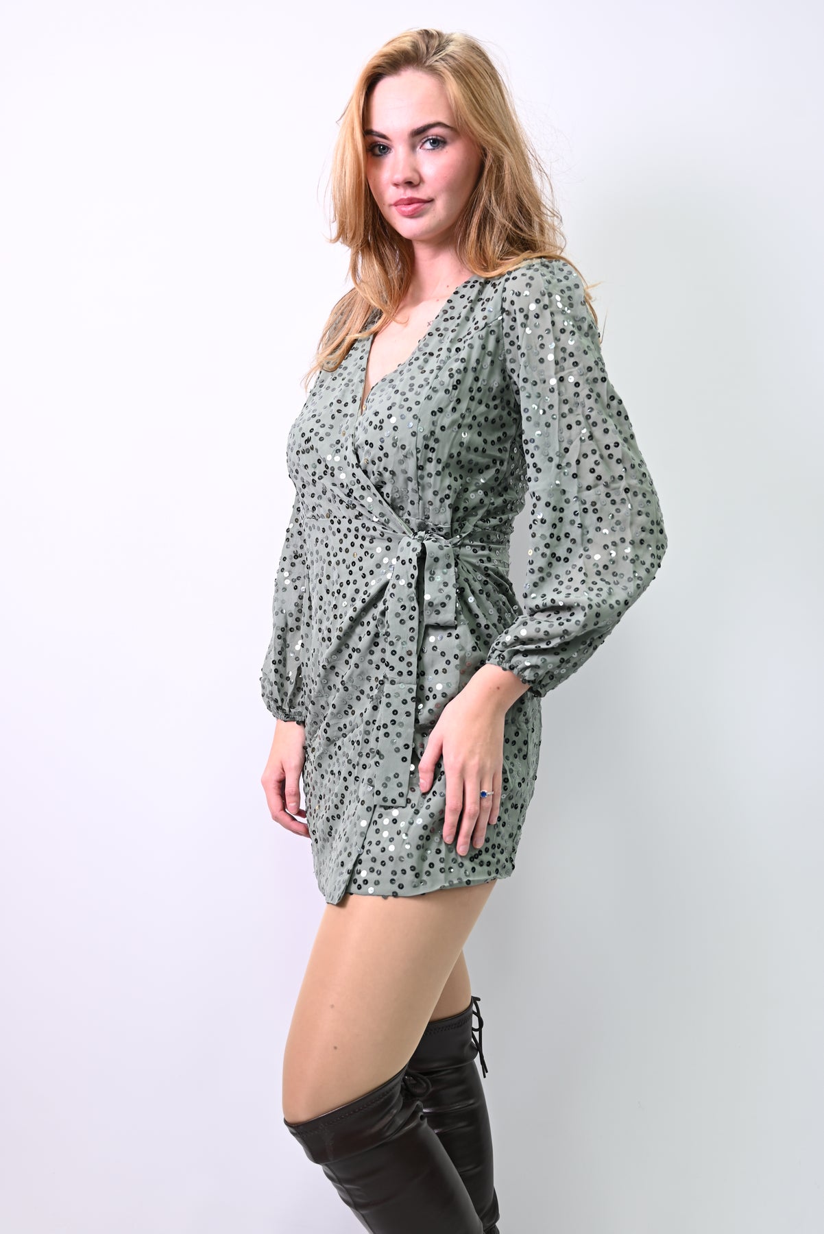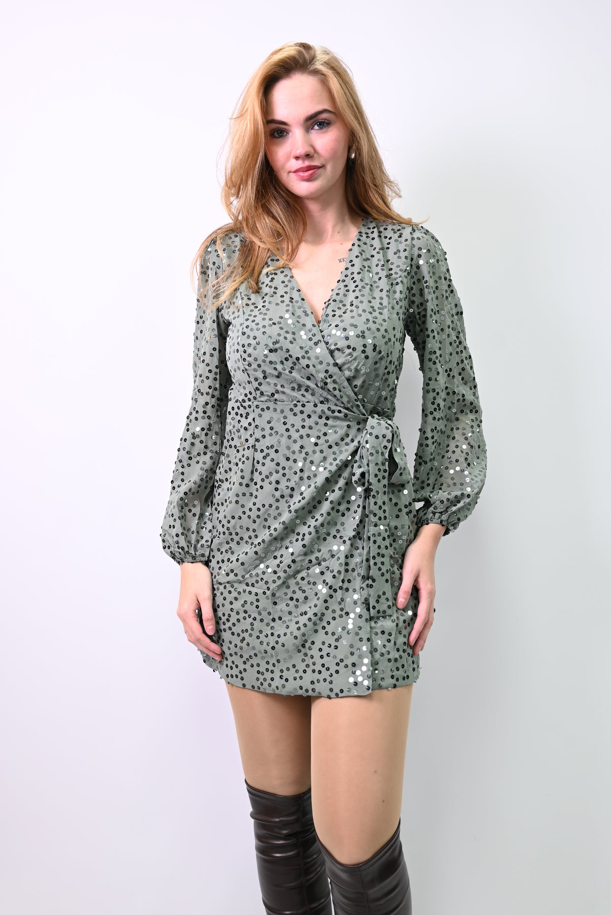 Een jurk die schittert zonder te schreeuwen. L’Éclat Tamisé is een mini-jurk in taupe pailletten, ontworpen om het licht te vangen met fluisterende flair. De diepe V-hals en gedefinieerde taille accentueren het silhouet, terwijl de uitwaaierende rok beweging toevoegt. Gecombineerd met chunky over-the-knee boots ontstaat een look die kracht en zachtheid verenigt—een outfit voor avonden waarop je niet op zoek bent naar aandacht, maar hem vanzelf aantrekt.