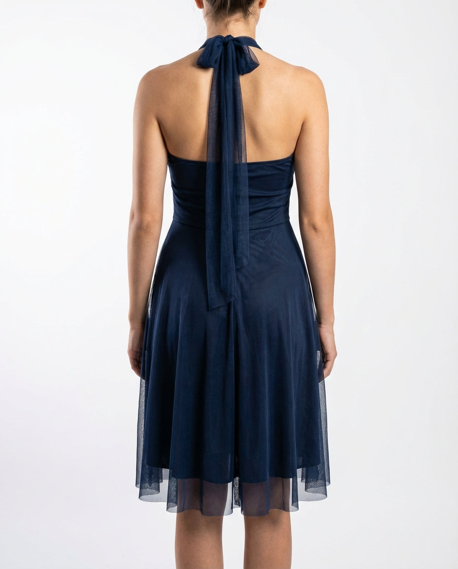 Een fluistering van nachtelijke elegantie. Deze navyblauwe halterjurk met geplisseerde bodice en transparante halslijn combineert verfijning met comfort. De rok beweegt licht en sierlijk, perfect voor formele avonden.