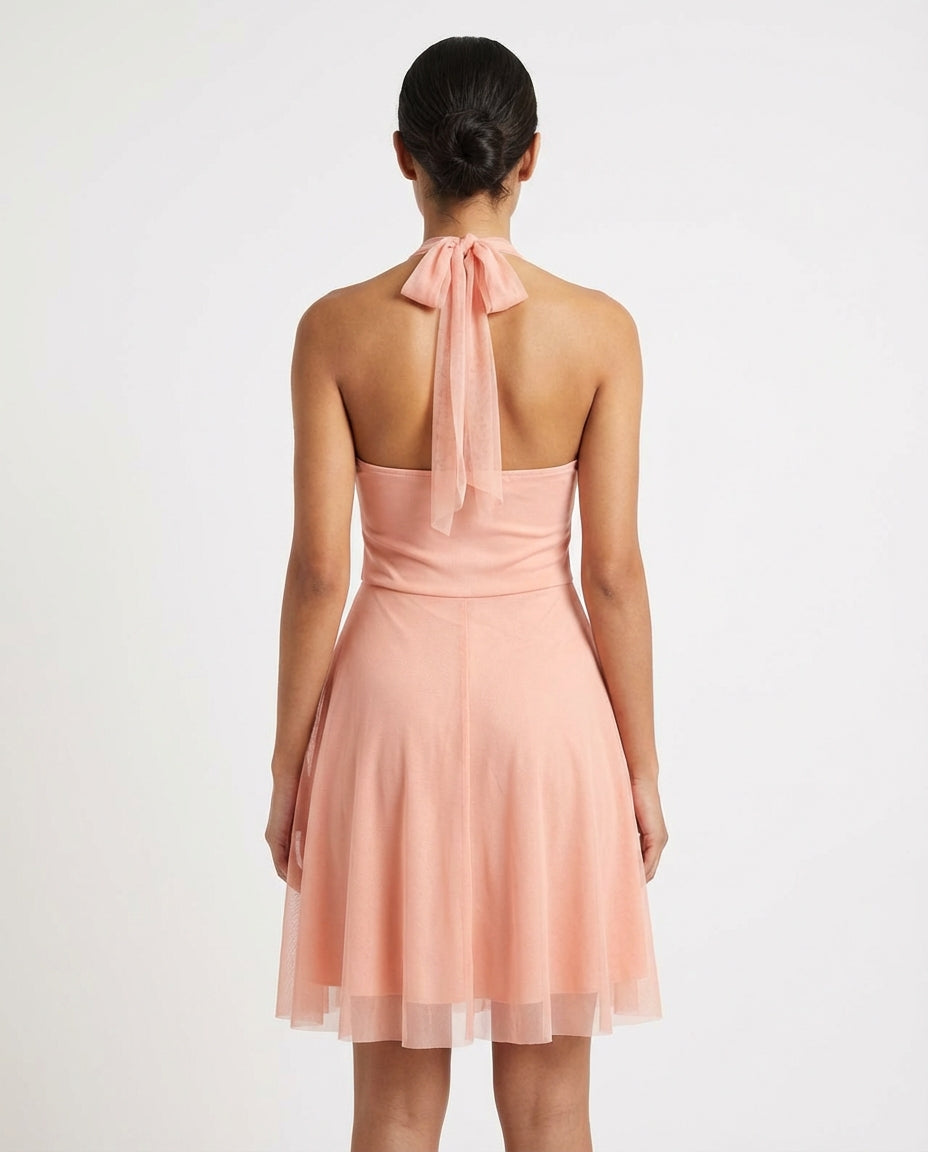 Zacht als zomerlicht. Deze perzikkleurige halterjurk combineert een geplisseerde bodice met een transparante rok die sierlijk beweegt. De brede tailleband accentueert het silhouet met een romantische toets.