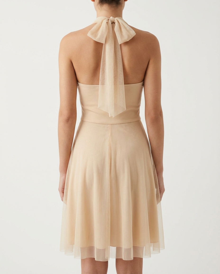 SEO-tags: beige jurk, halterjurk, V-hals jurk, formele damesjurk, minimalistische jurk