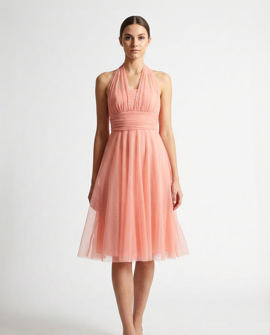 SEO-tags: perzikkleurige jurk, halterjurk, plissé bodice, romantische damesjurk, zomerjurk