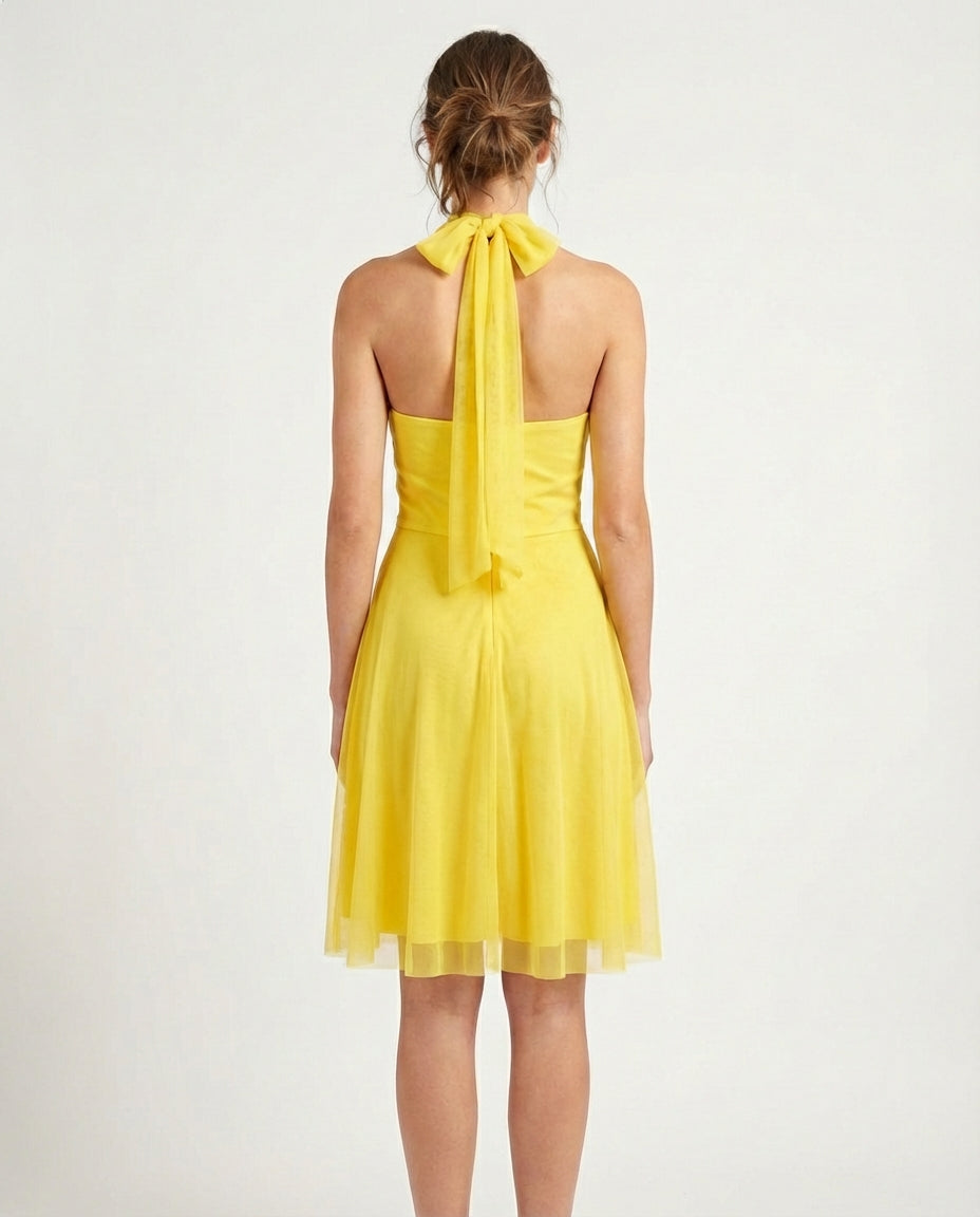 Een zonnestraal in beweging. Deze heldergele halterjurk straalt energie uit met haar geplisseerde bodice, cinched taille en luchtige rok. Een zomerse blikvanger voor feestelijke gelegenheden.