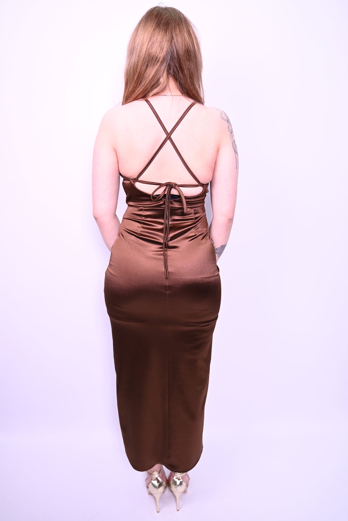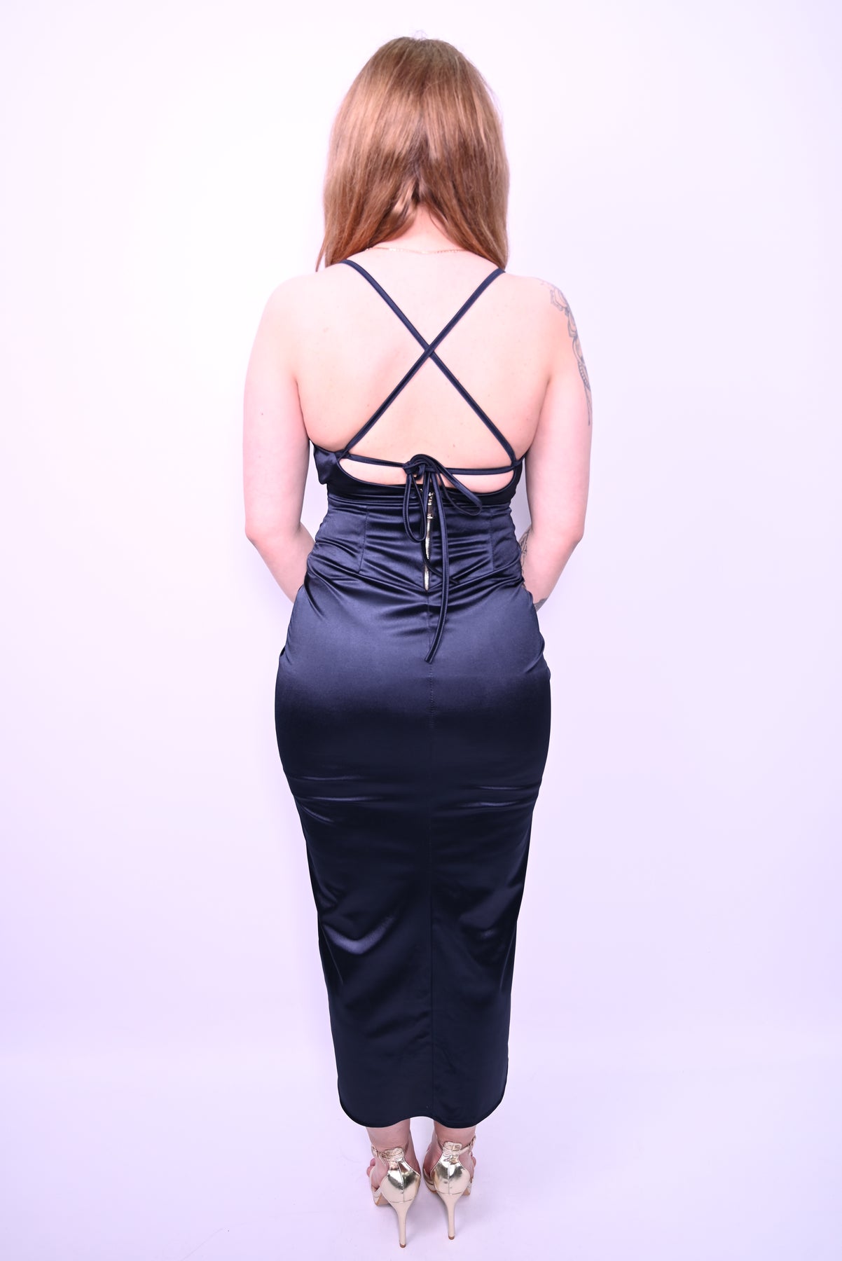 Lichaamsgedicht is een verleidelijke avondjurk die het lichaam accentueert met een strakke pasvorm, diepe V-hals en hoge split. Gemaakt van glanzende satijnstof die soepel langs het silhouet valt. De zichtbare tattoos versterken de persoonlijke stijl en maken van deze jurk een statement van kracht en elegantie.