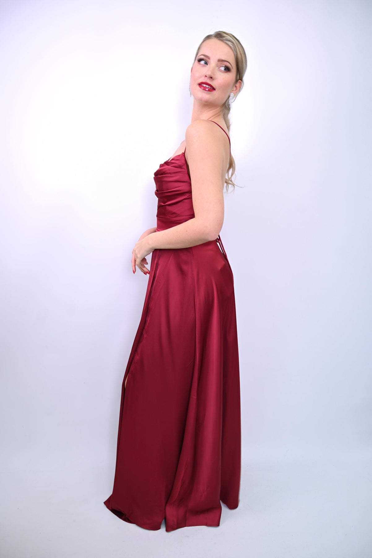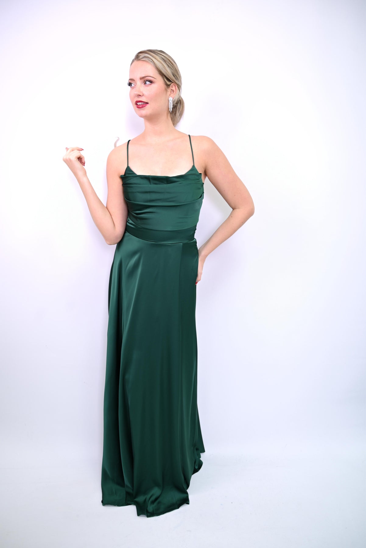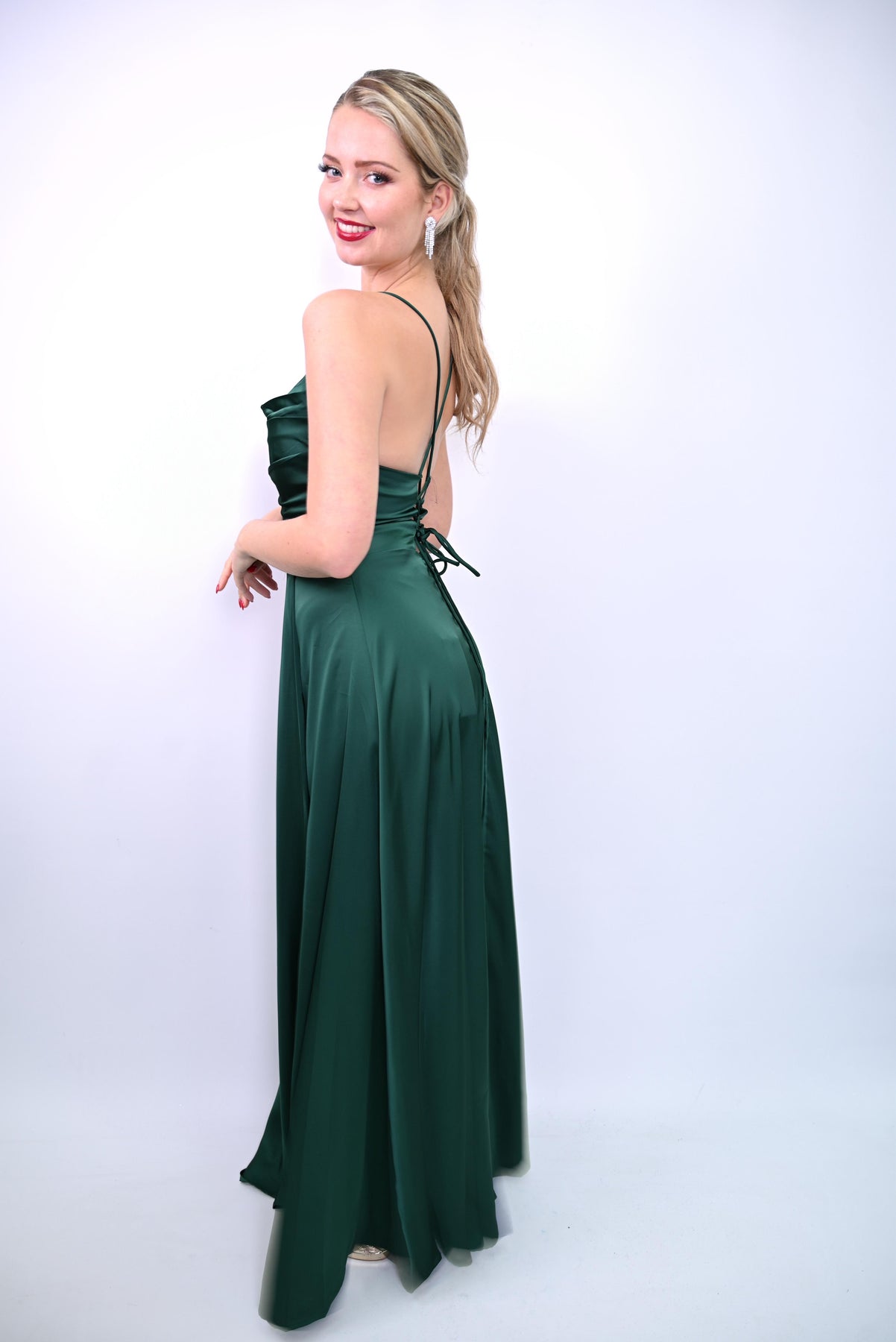 groene galajurk, satijnen avondjurk, jurk met split, elegante feestjurk