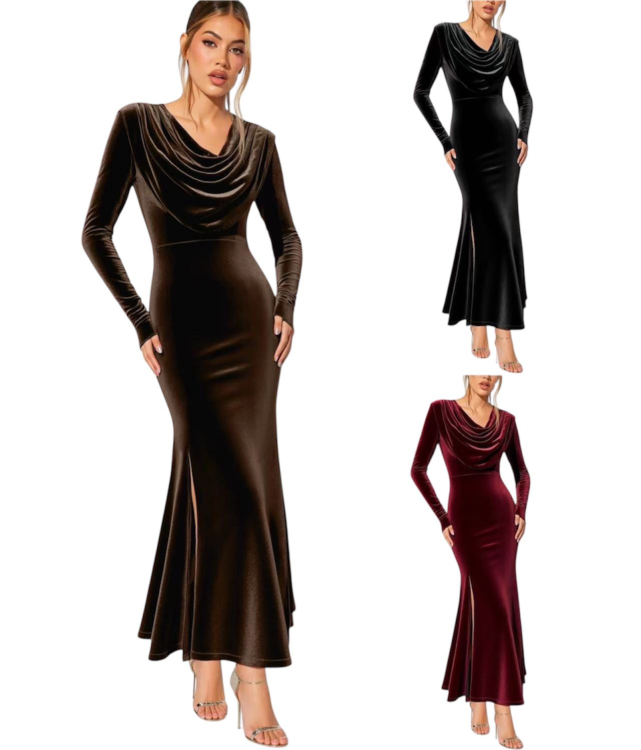 SEO EN: Brown velvet women’s dress, long sleeve evening gown, elegant dress with slit