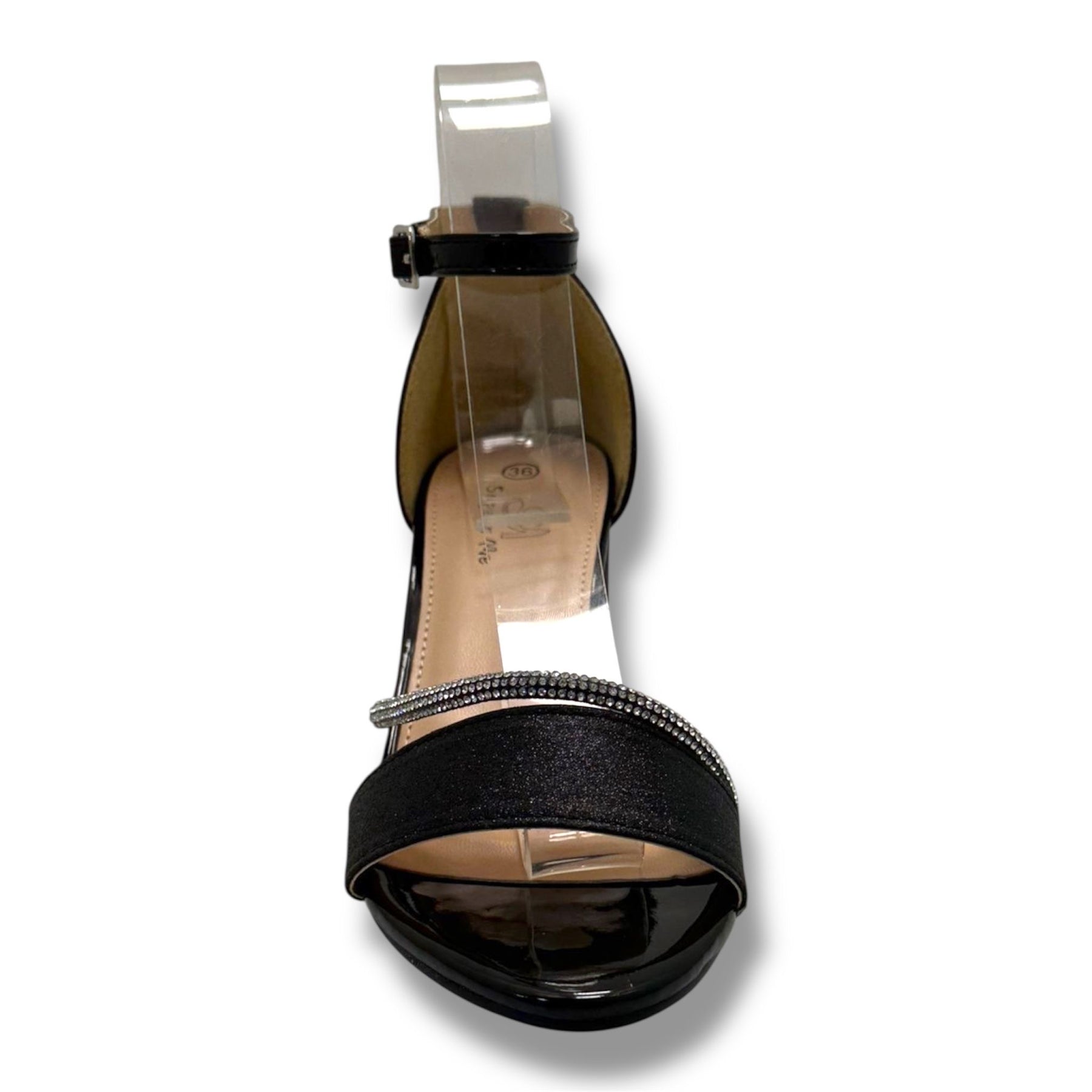 De Noir Chic is jouw subtiele eyecatcher. Deze zwarte sandaal met blokhak en open teenontwerp is afgewerkt met een glinsterende strassband voor een vleugje luxe. De verstelbare enkelband en het zachte voetbed zorgen voor een comfortabele pasvorm. Ideaal voor zowel formele gelegenheden als een stijlvolle avondlook.