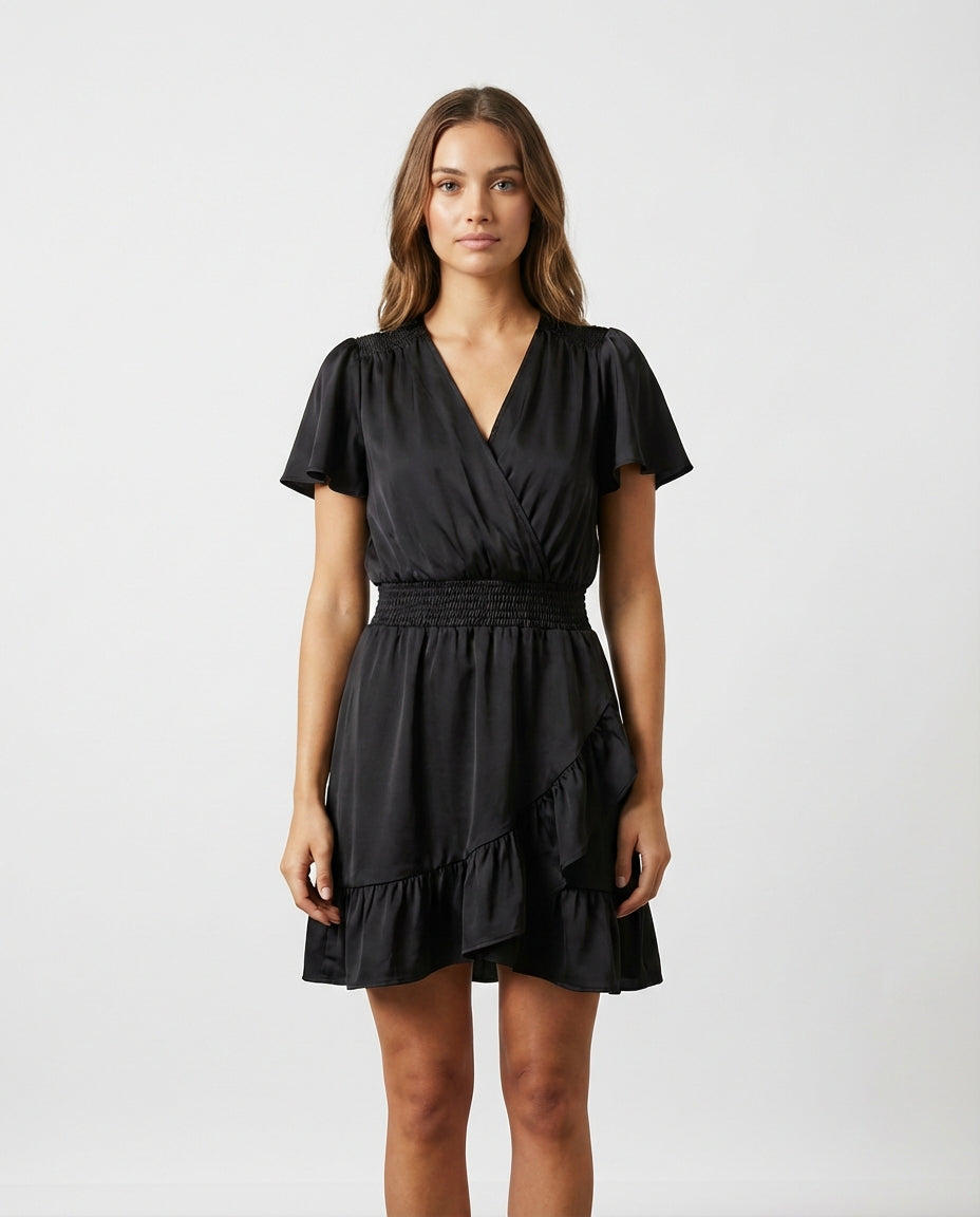 Een ode aan tijdloze elegantie. Deze zwarte jurk omarmt je silhouet met een smocktaille en vloeiende ruches die dansen bij elke stap. De V-hals en wikkelbodice geven een verfijnde touch, terwijl de korte mouwen luchtig en vrouwelijk aanvoelen. Perfect voor avondwandelingen of een stijlvolle brunch.