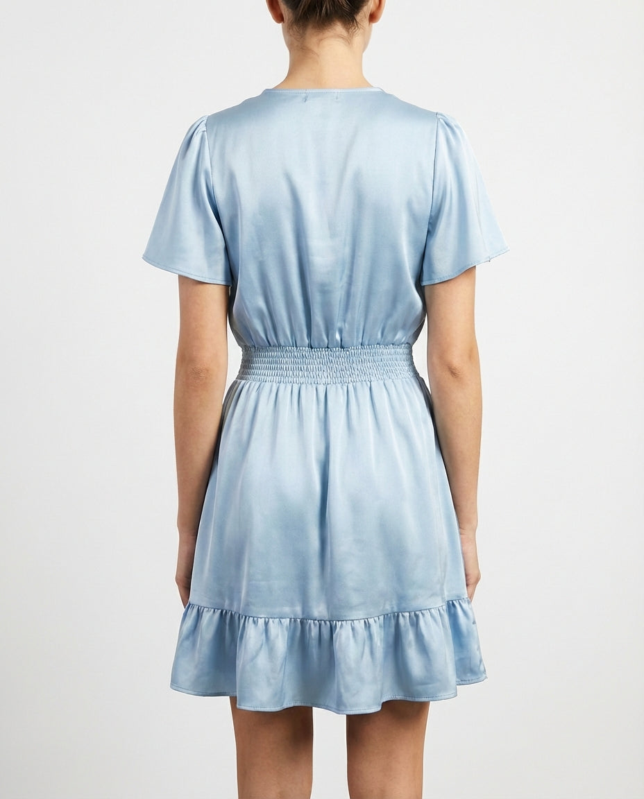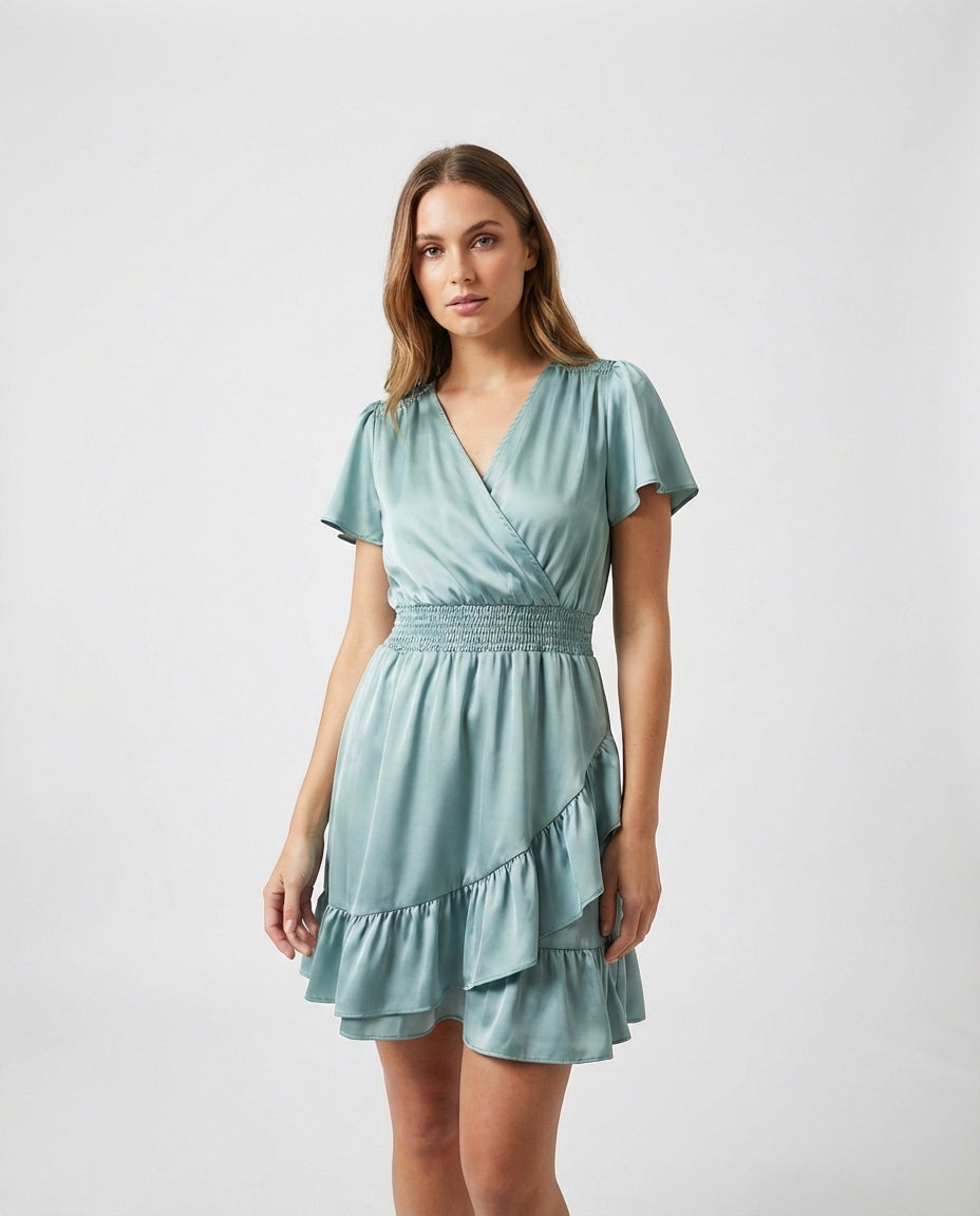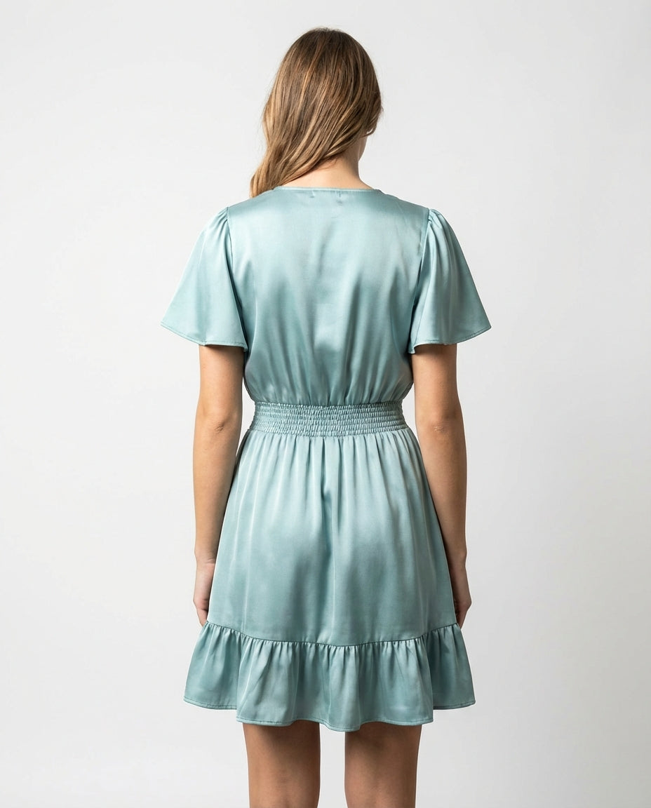 Zacht als een lentebries, glanzend als ochtenddauw. Deze licht teal satijnen jurk combineert een wikkelbodice met een gelaagde rucherok en een smocktaille die je taille accentueert. De korte vlindermouwen geven een speelse flair aan dit verfijnde silhouet.