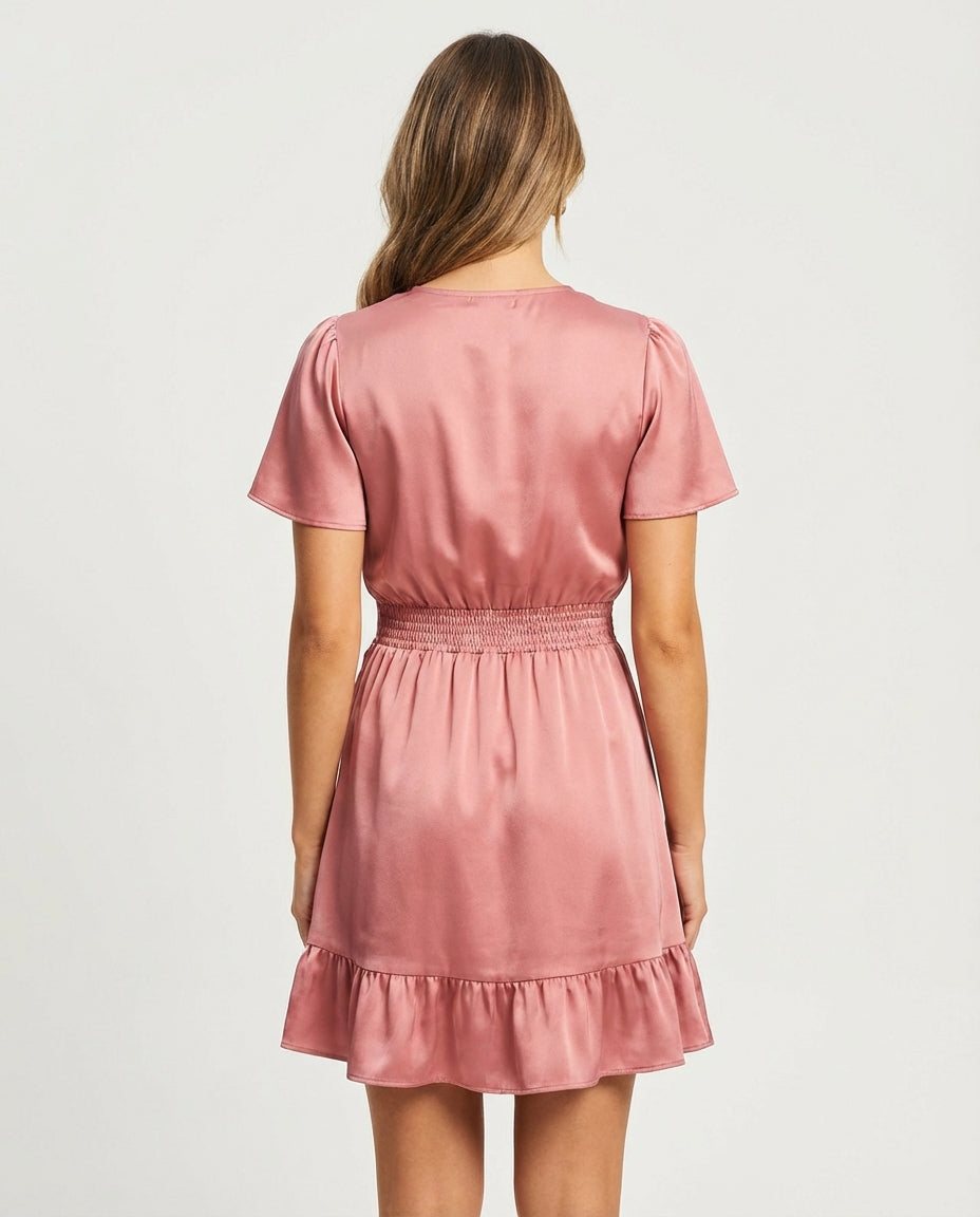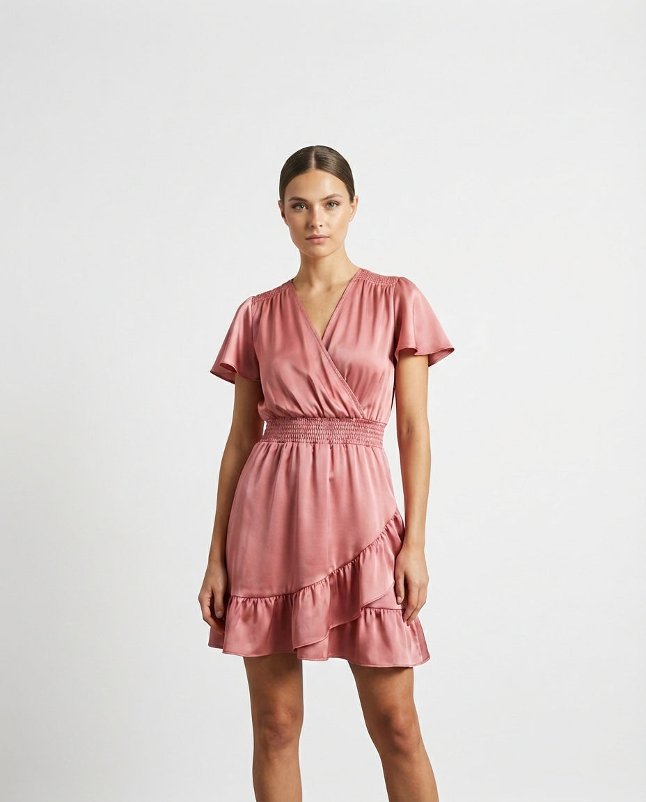 Een dromerige jurk in poederroze satijn, ontworpen voor zachtheid en charme. De wikkelbodice en smocktaille creëren een flatterend silhouet, terwijl de ruches en vlindermouwen zorgen voor een speelse, vrouwelijke uitstraling. Ideaal voor een lente-event of een casual chic moment.
