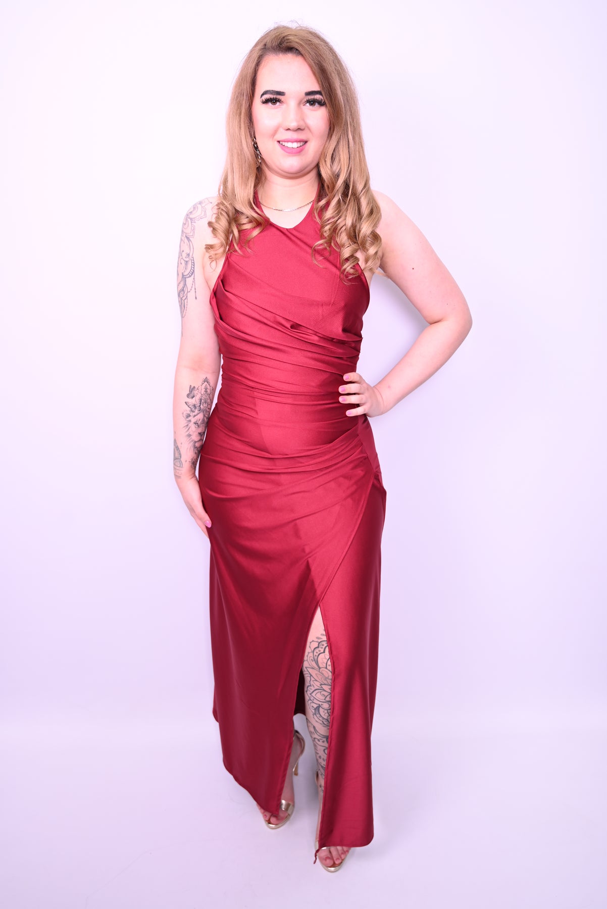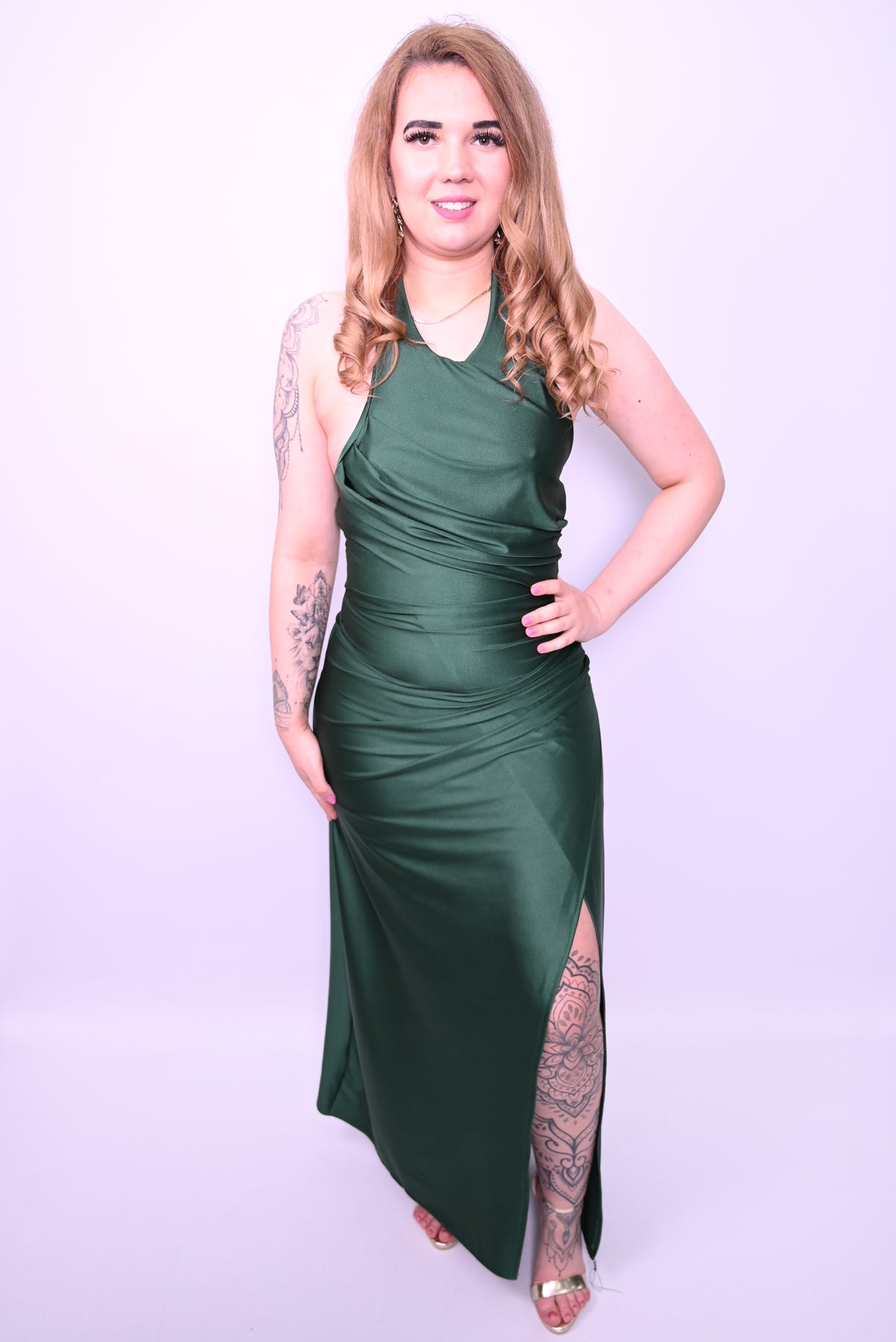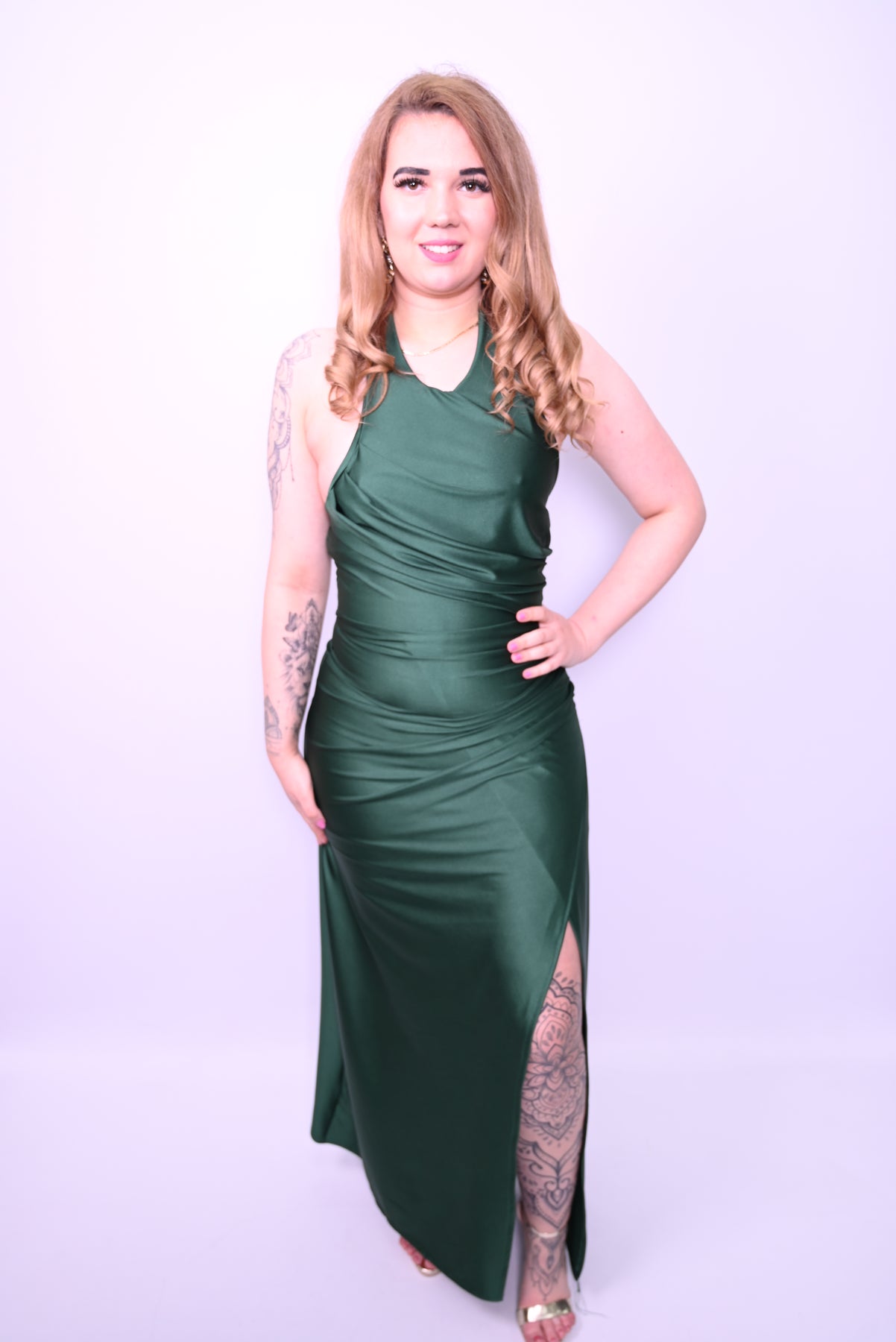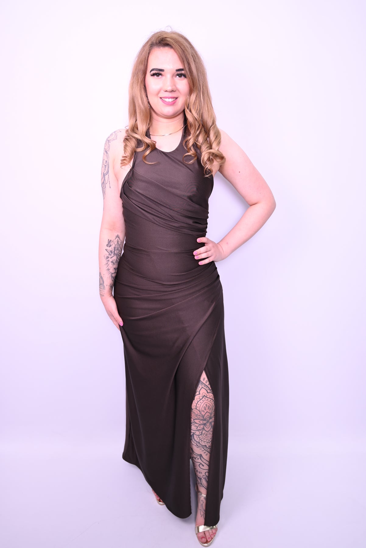 Lichaamsgedicht is een lange avondjurk die het lichaam omhelst met elegantie, attitude en een vleugje rebellie. De jurk is gemaakt van glanzende satijnstof en heeft een diepe V-hals, een hoge split en een nauwsluitende pasvorm die het silhouet accentueert. De zichtbare tattoos versterken de persoonlijke stijl en maken van deze jurk een krachtig mode-statement.