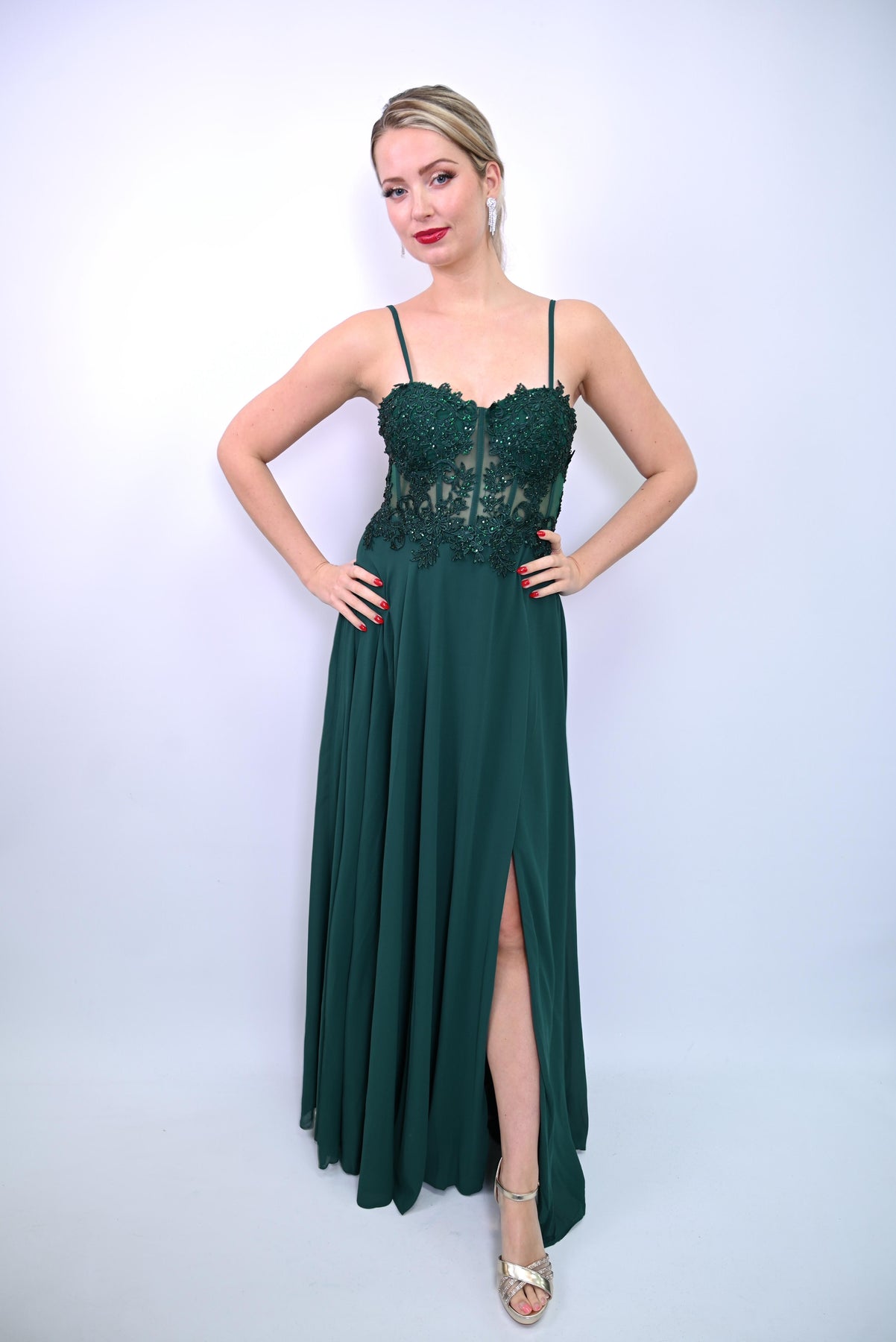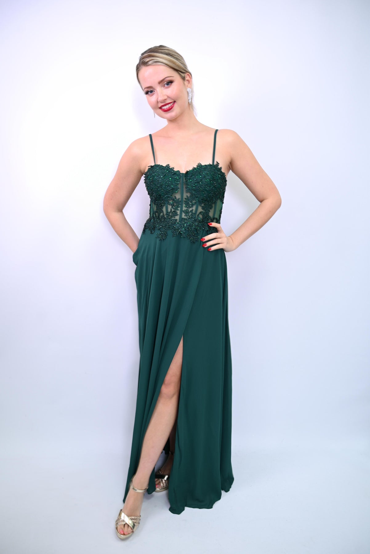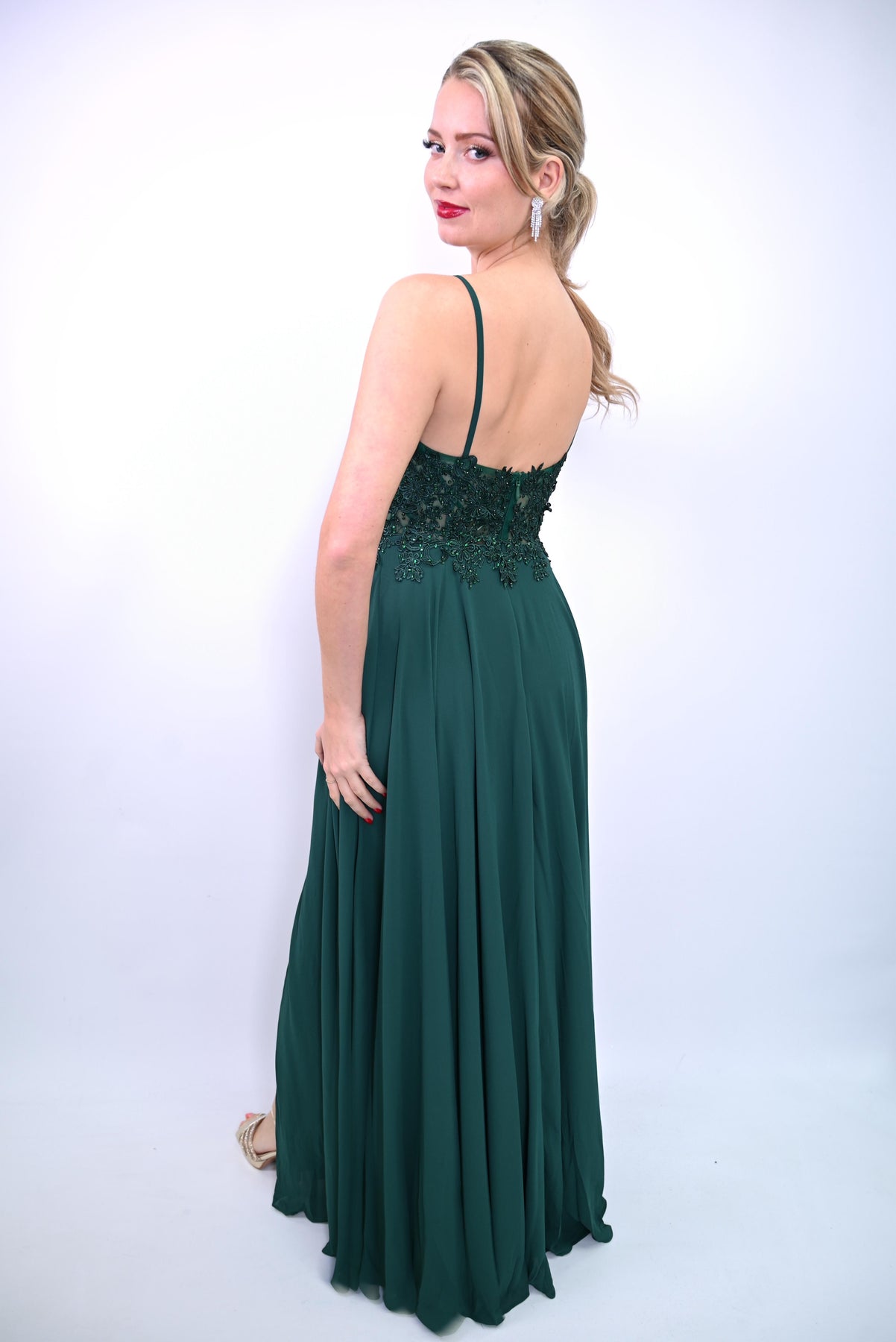 Een donkergroene jurk met kanten details en een elegante split. Smaragdfluistering is een bosdroom vol mystiek en klasse. Perfect voor winterbruiloften en avondfeesten.