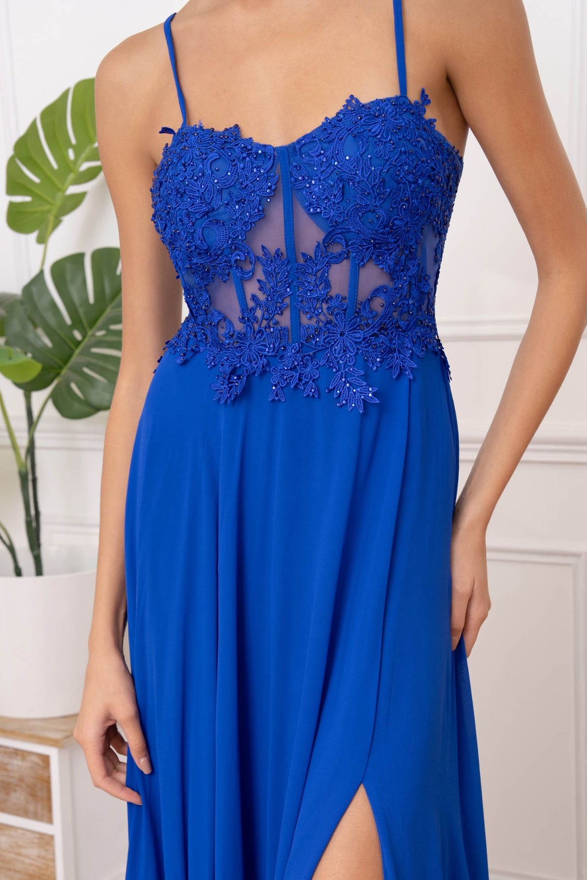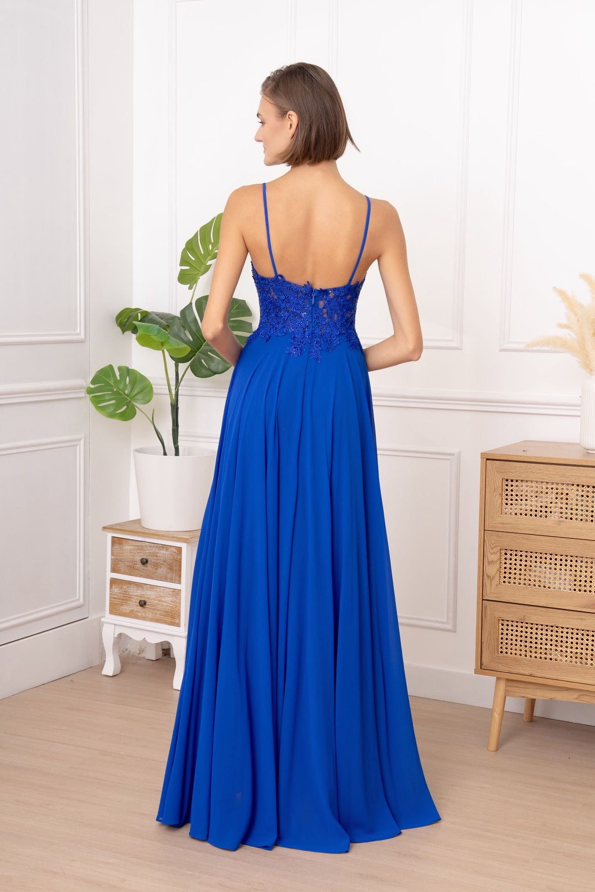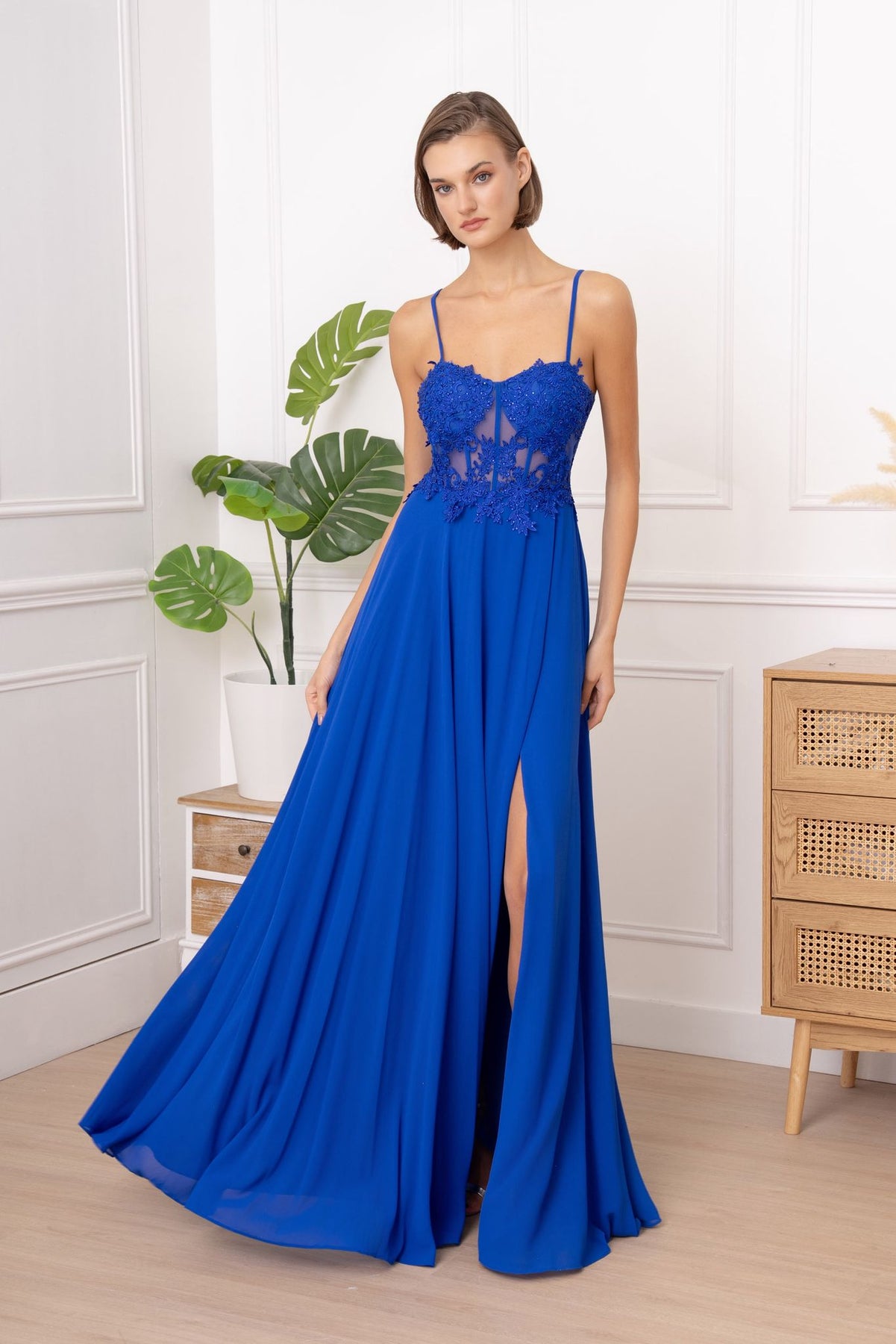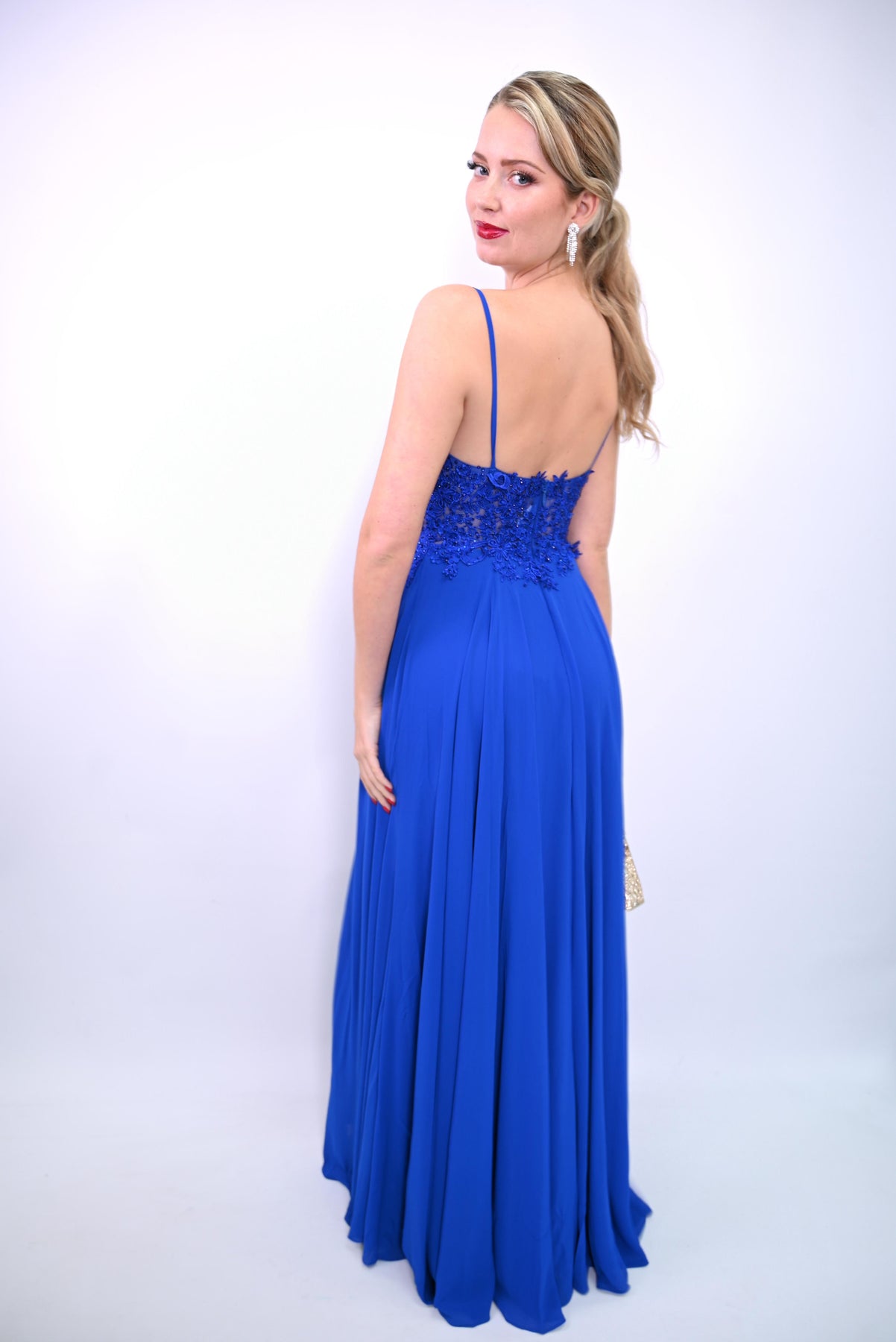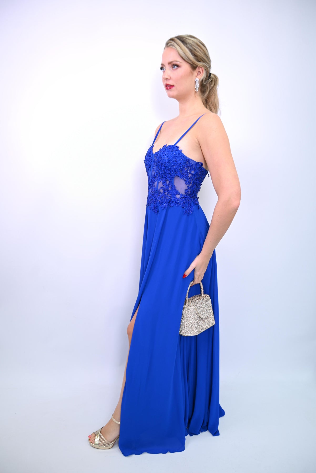koningsblauwe galajurk, kanten avondjurk, jurk met split