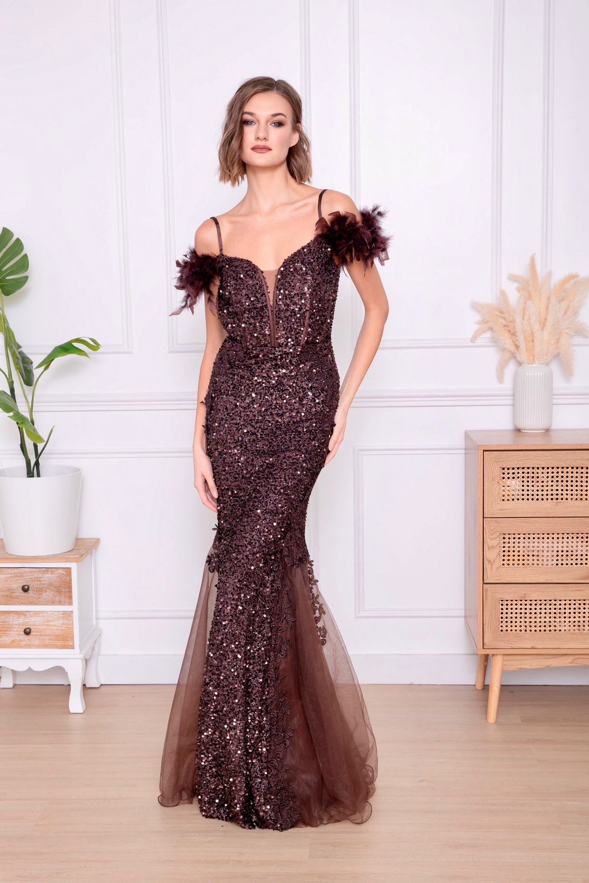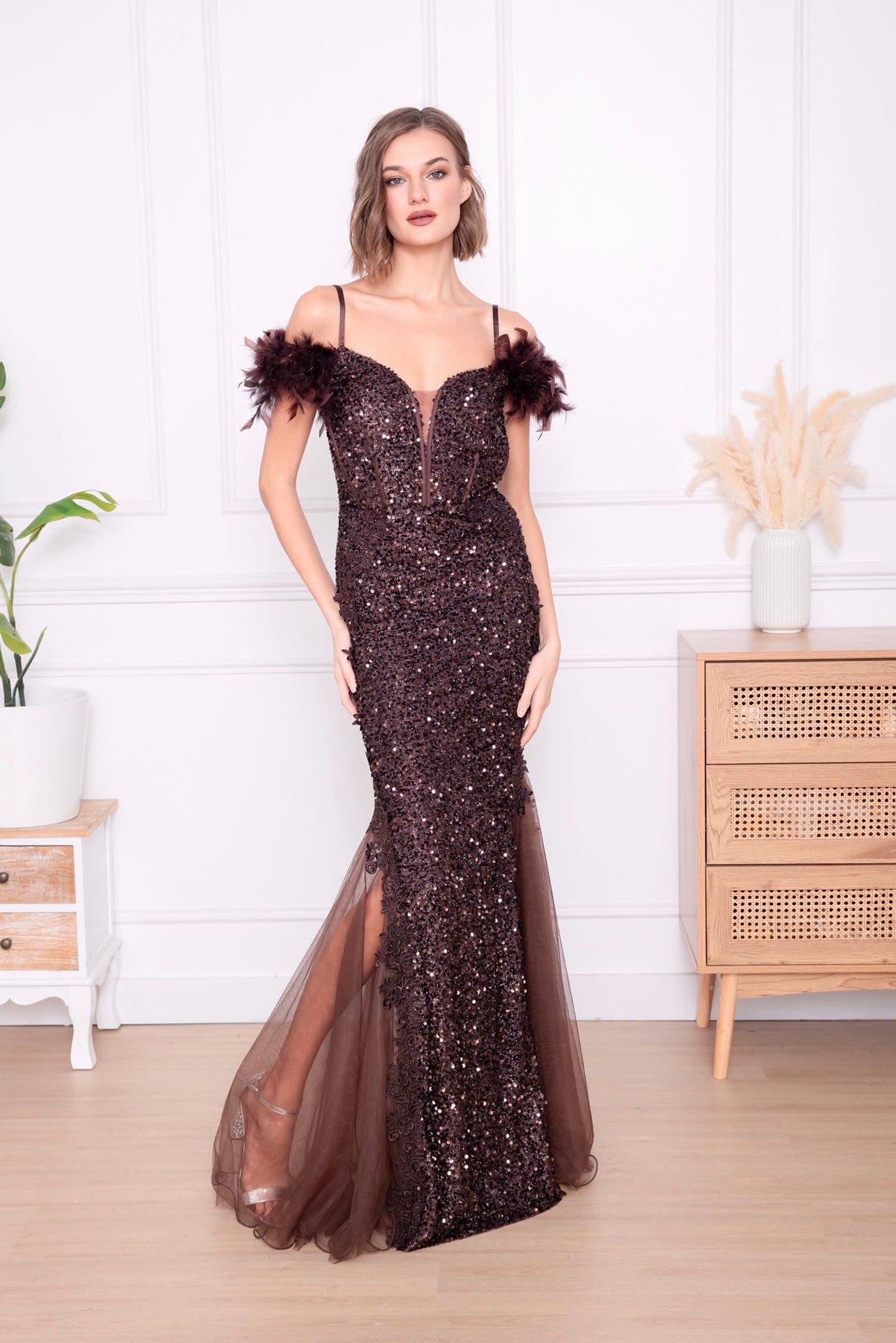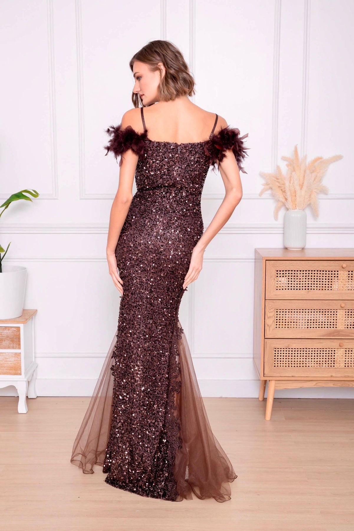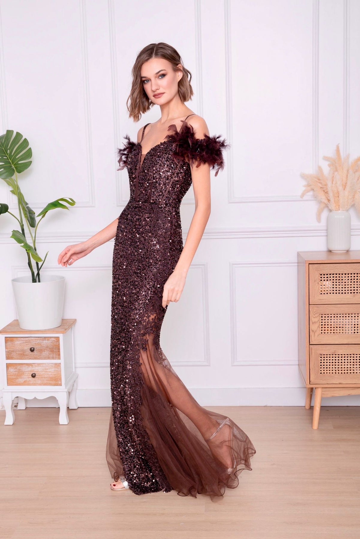 Ontwaak in de magie van de nacht met onze Avondglans jurk—een betoverende avondjurk in dieprode pailletten, ontworpen om te schitteren bij elke stap. De off-shoulder veren geven een speelse, theatrale flair, terwijl de transparante tulezoom elegant uitwaaiert als een sluier van sterrenstof. Perfect voor gala’s, winterbruiloften of een onvergetelijke entree.