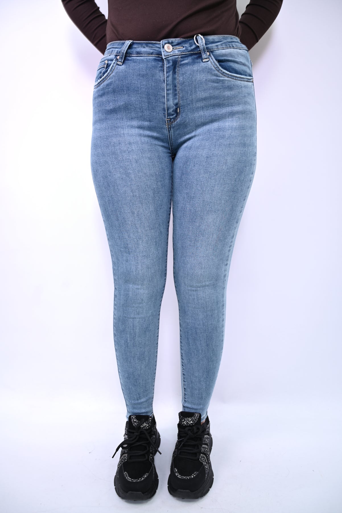 Een high-rise skinny jeans in een lichte tot medium lichtblauwe wassing (light wash). De broek heeft een nauwsluitende pasvorm over de hele lengte en een klassieke spijkerbroekstijl met zakken aan de voor- en achterzijde. De onderkant van de pijpen is licht onafgewerkt of omgeslagen en de jeans is gecombineerd met zwarte, dikke sneakers.