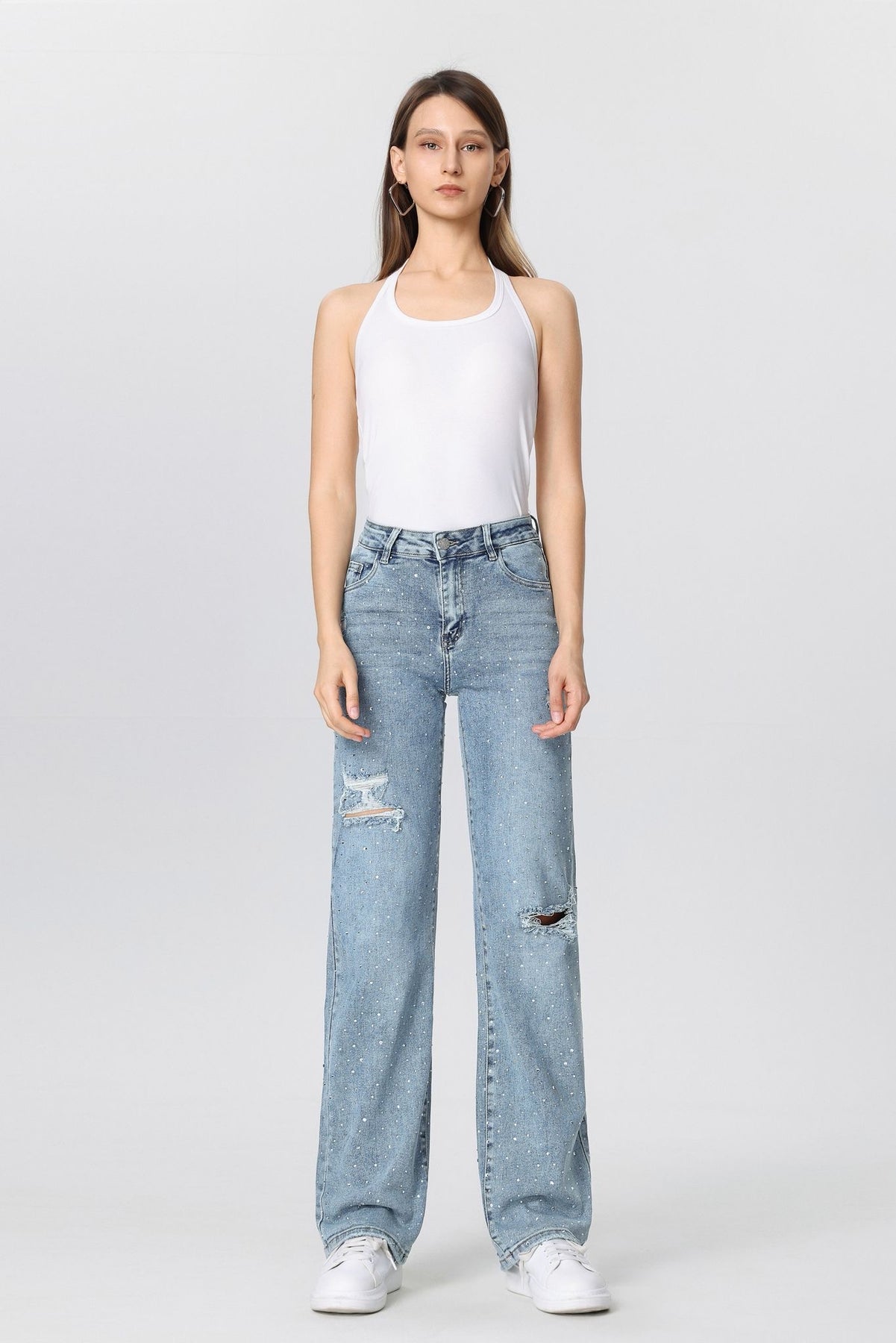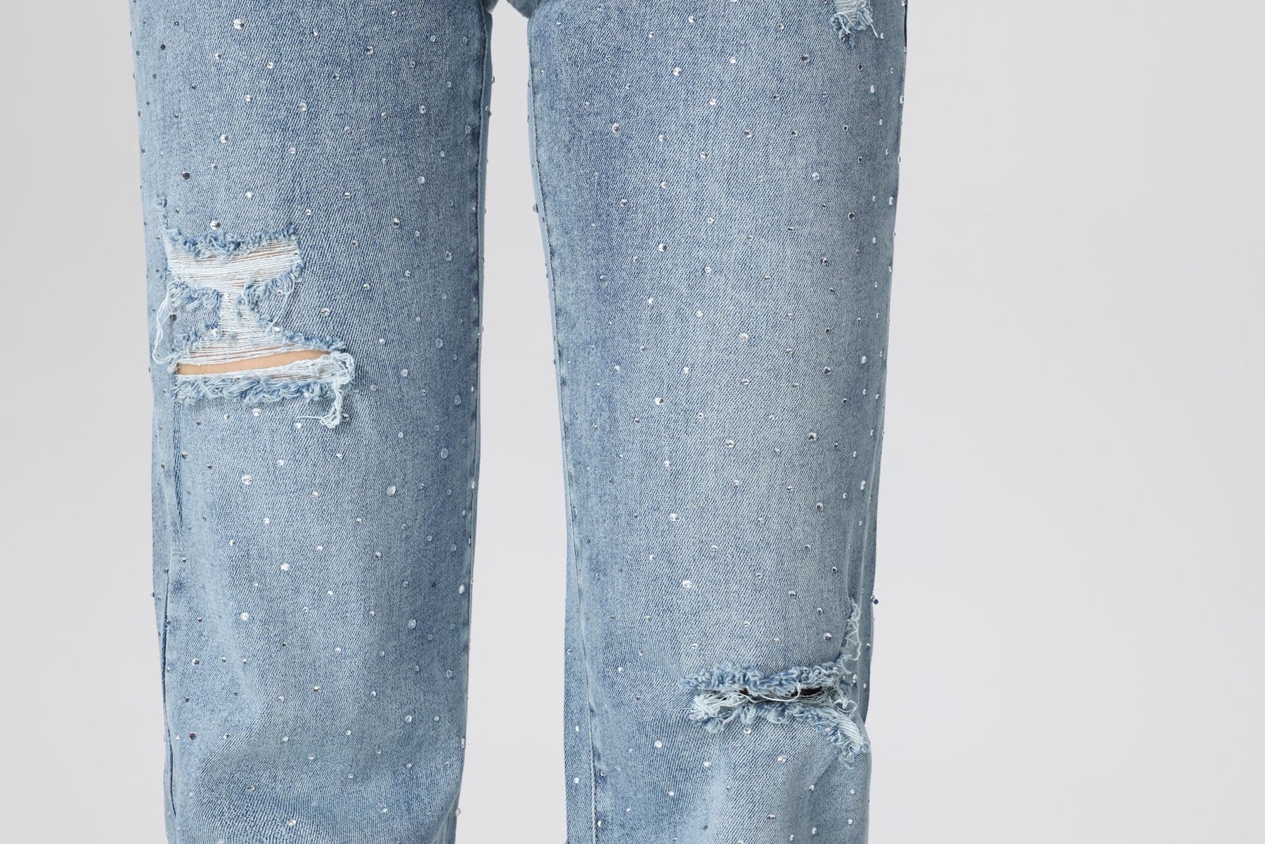 De Blue Glint jeans combineert casual comfort met een vleugje glamour. Deze high-waisted straight-leg spijkerbroek in lichtblauw denim is versierd met subtiele rhinestones en distressed details voor een edgy, sprankelende uitstraling. Perfect voor een streetwear look met karakter—draag met een witte top en sneakers voor een frisse, opvallende stijl.Keywords: glitter jeans dames, lichtblauwe spijkerbroek, rhinestone denim, straight leg jeans, streetwear met glans