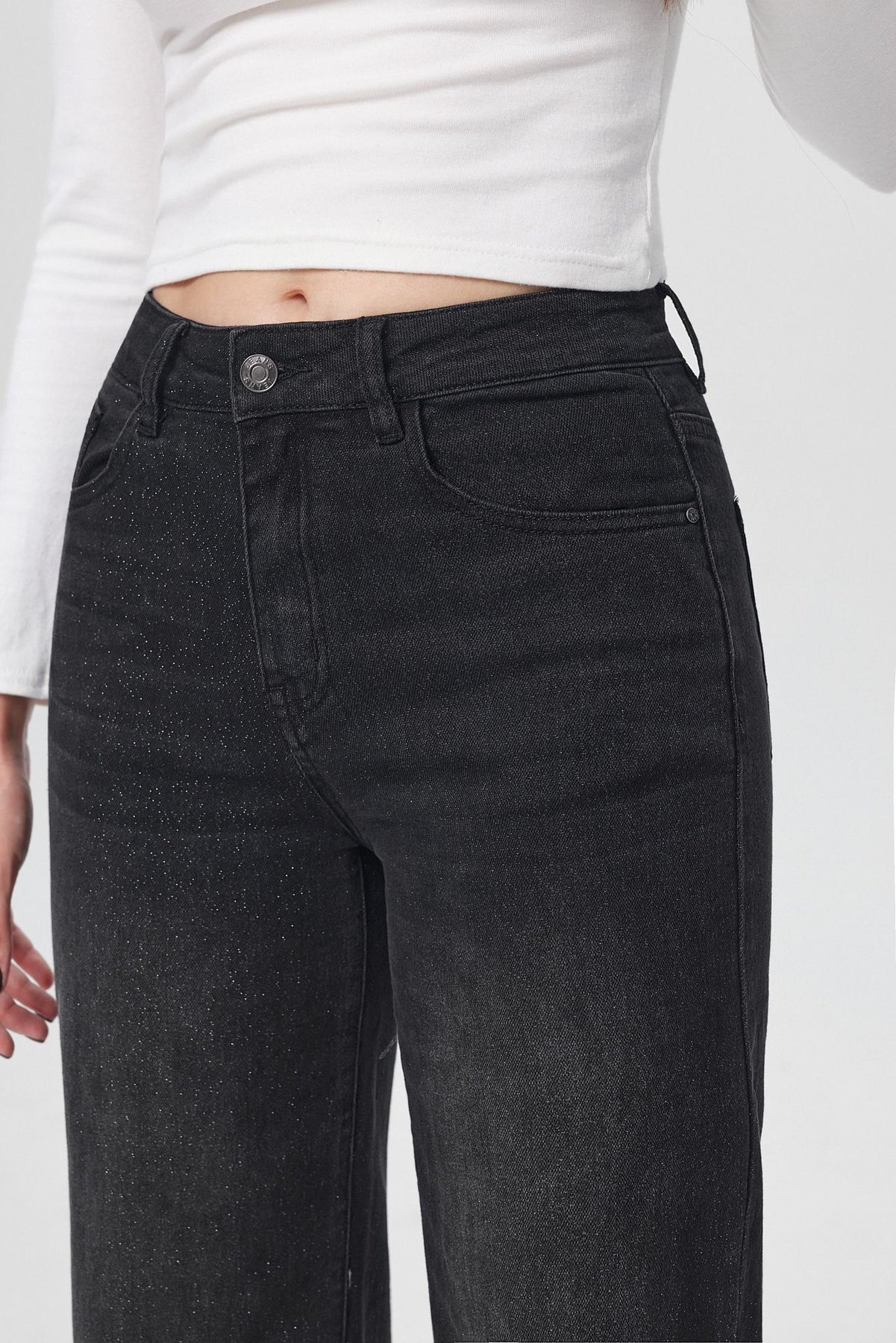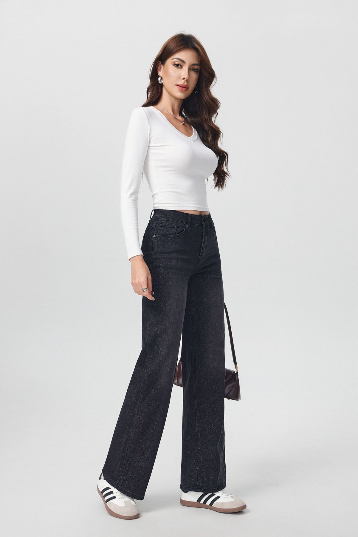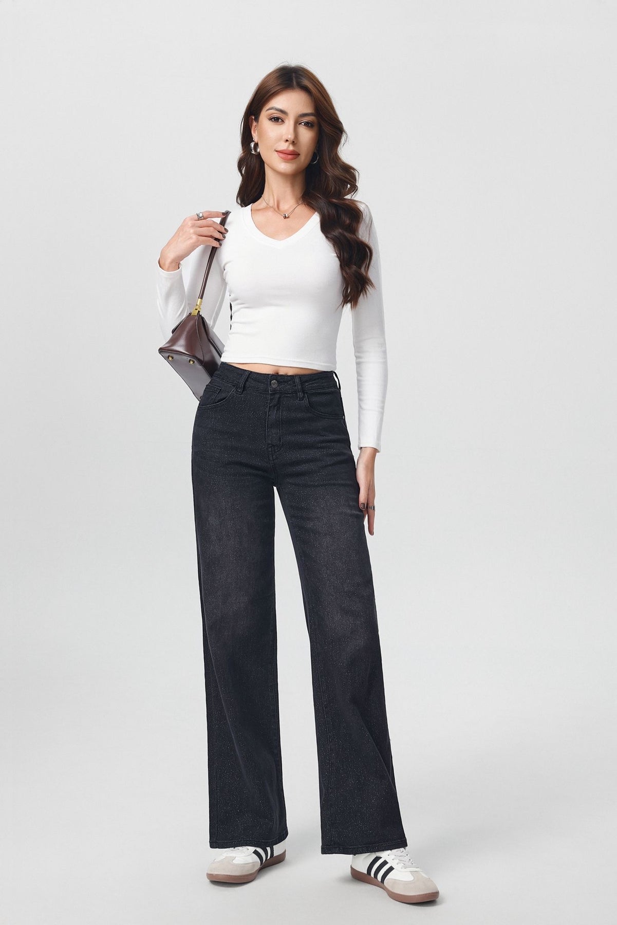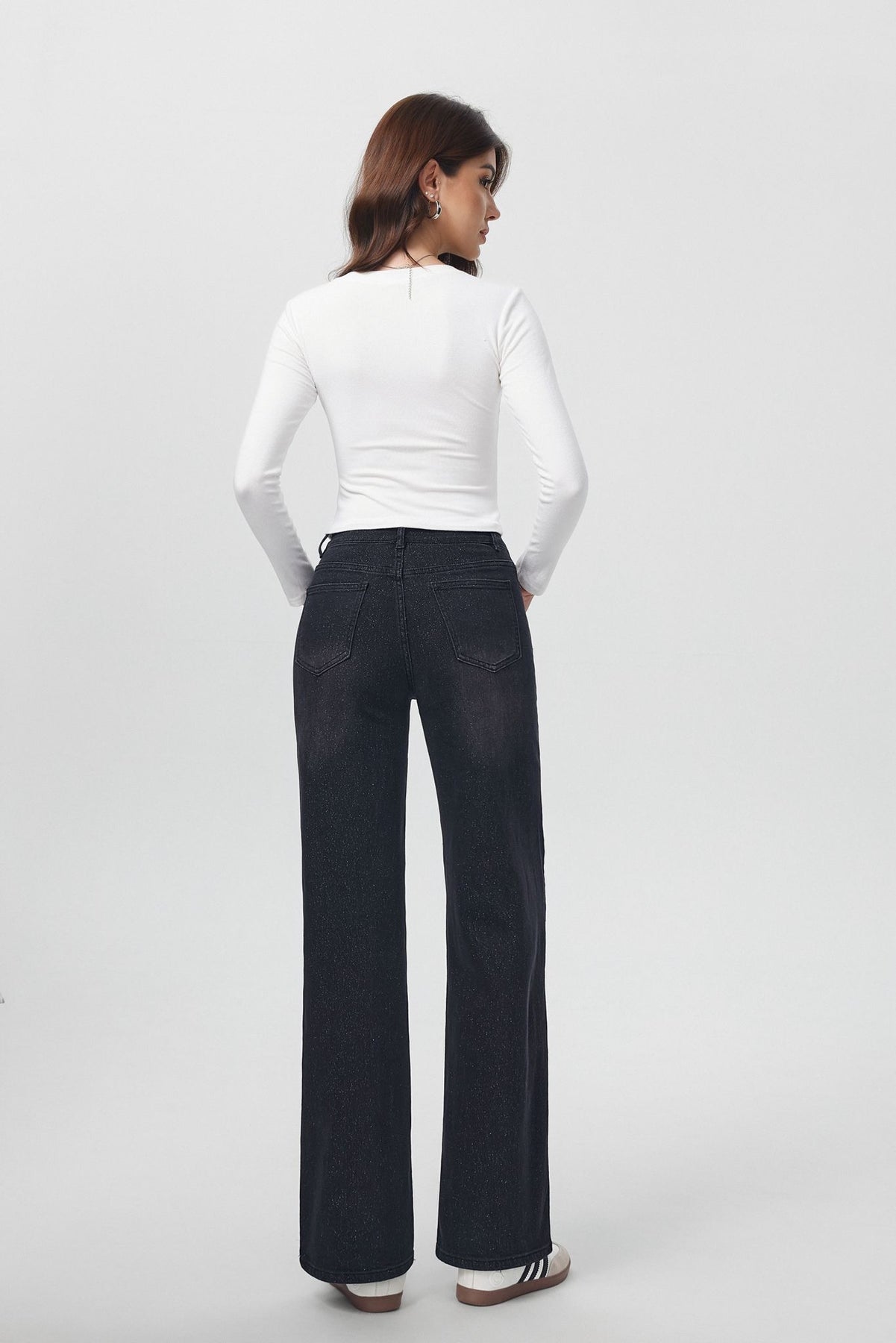 Een silhouet dat spreekt in fluisteringen van glans. Nachtlijn is een high-waisted wide-leg jeans met een subtiele Lurex-weving die het zwart een mysterieuze diepte geeft. De pasvorm verlengt het been en accentueert de taille, terwijl de glanzende textuur een vleugje avondlicht toevoegt aan je dagelijkse stijl. Combineer met een witte top en sneakers voor een effortless city look, of upgrade met hakken voor een nacht vol mogelijkheden.