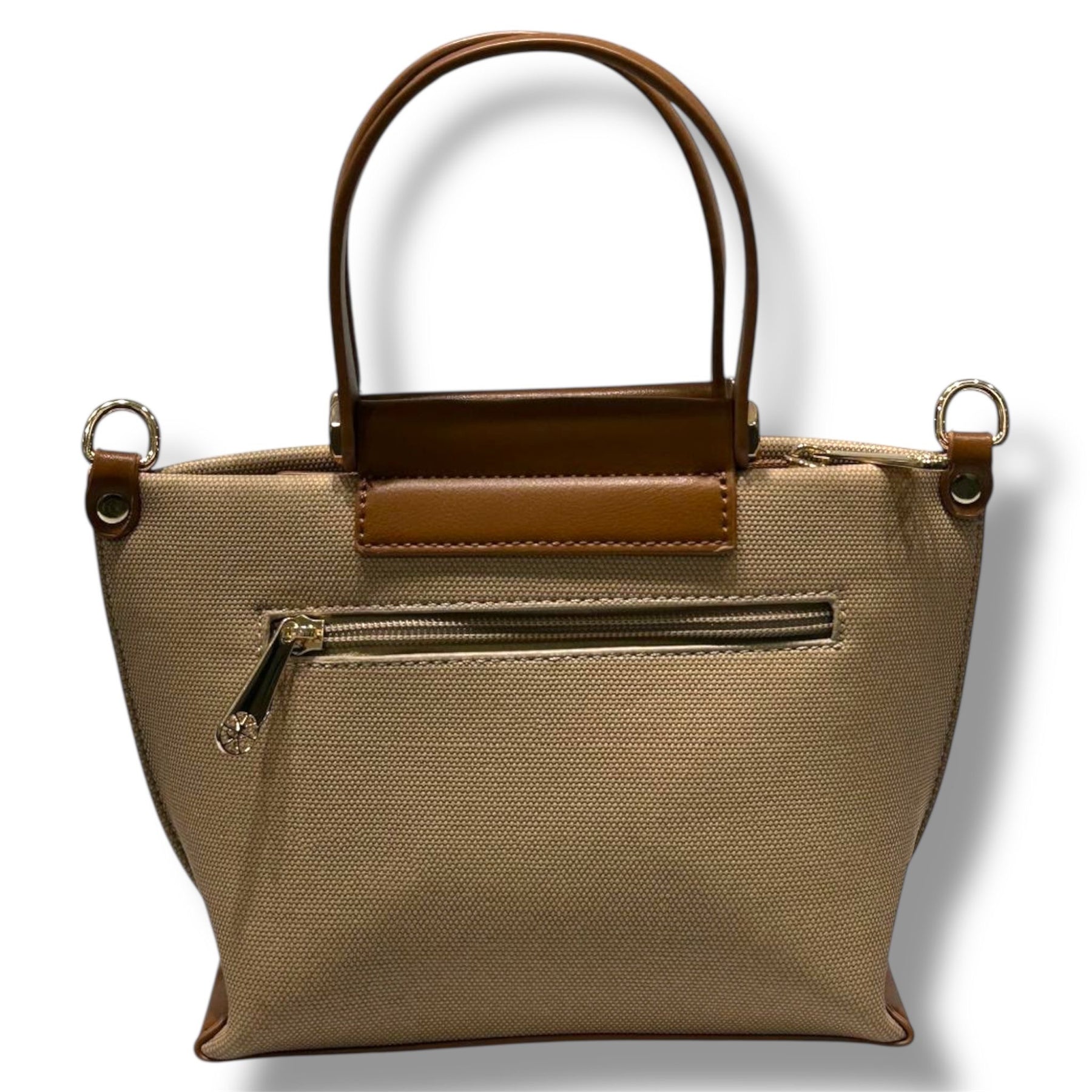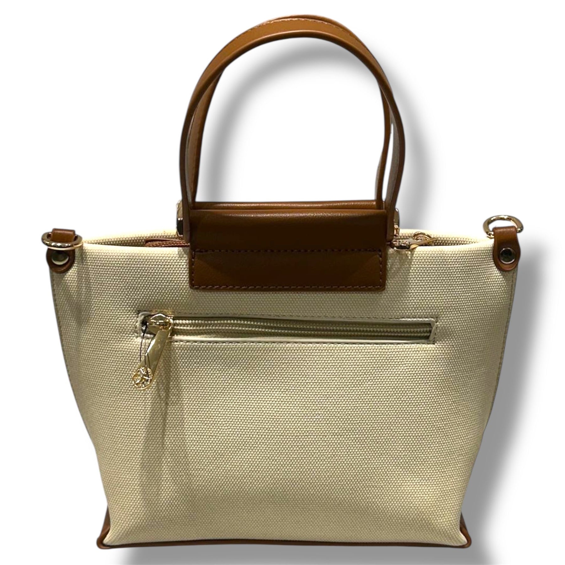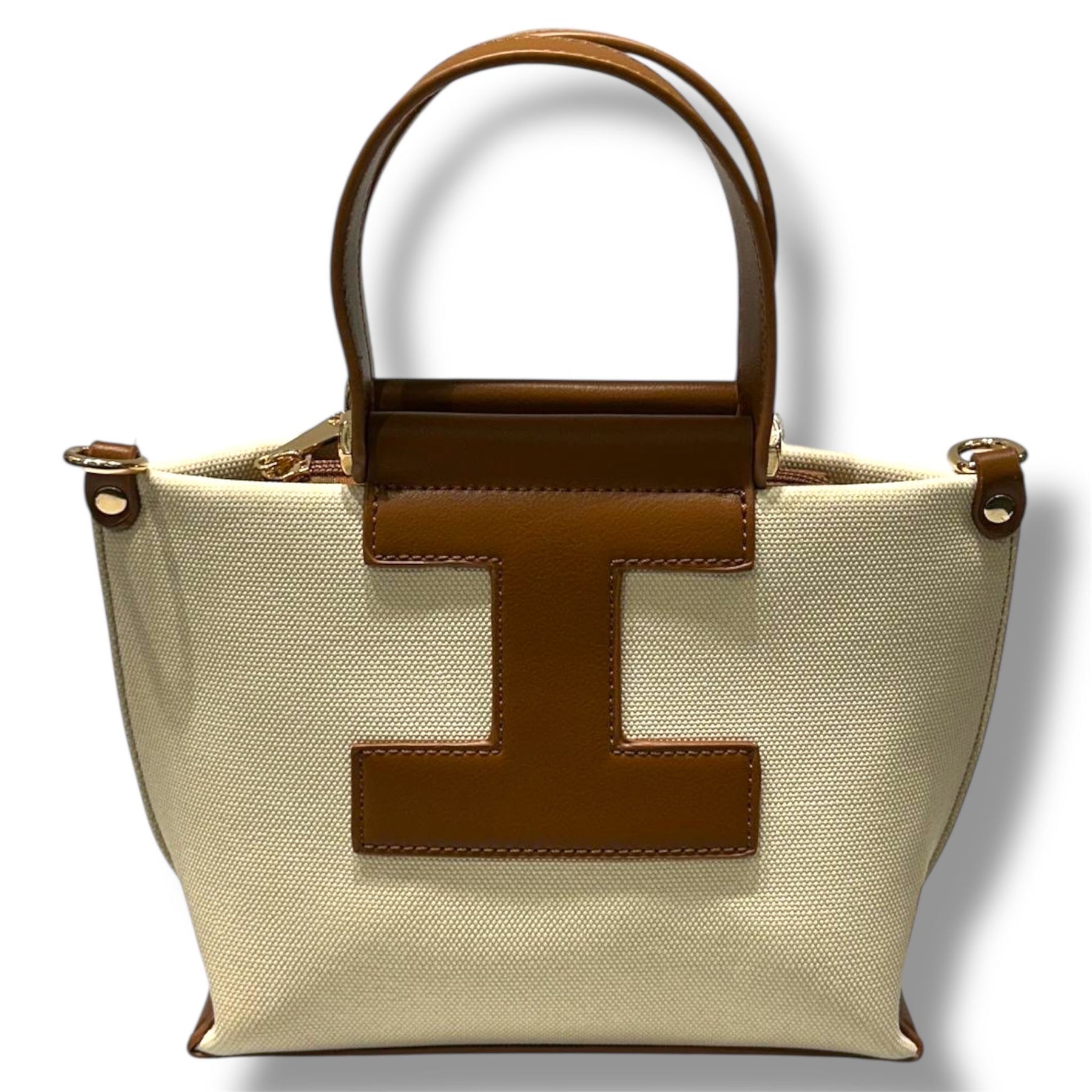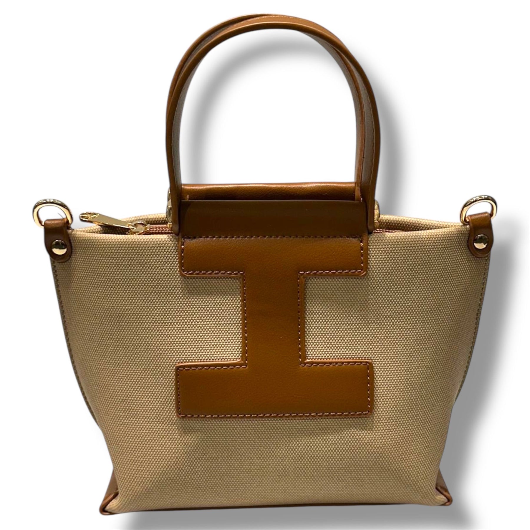 De Iconique Canvas Handtas is een moderne klassieker die elegantie en functionaliteit moeiteloos combineert. Gemaakt van stevig beige canvas en verfijnd met rijke bruine leren accenten, straalt deze tas een tijdloze charme uit. Het opvallende leren “I”-motief op de voorzijde geeft de tas een herkenbare en stijlvolle signatuur. Met stevige handgrepen en metalen ringen voor een optionele schouderriem is deze tas perfect voor zowel dagelijks gebruik als speciale gelegenheden. Een must-have accessoire voor wie houdt van subtiele luxe en een strak design.