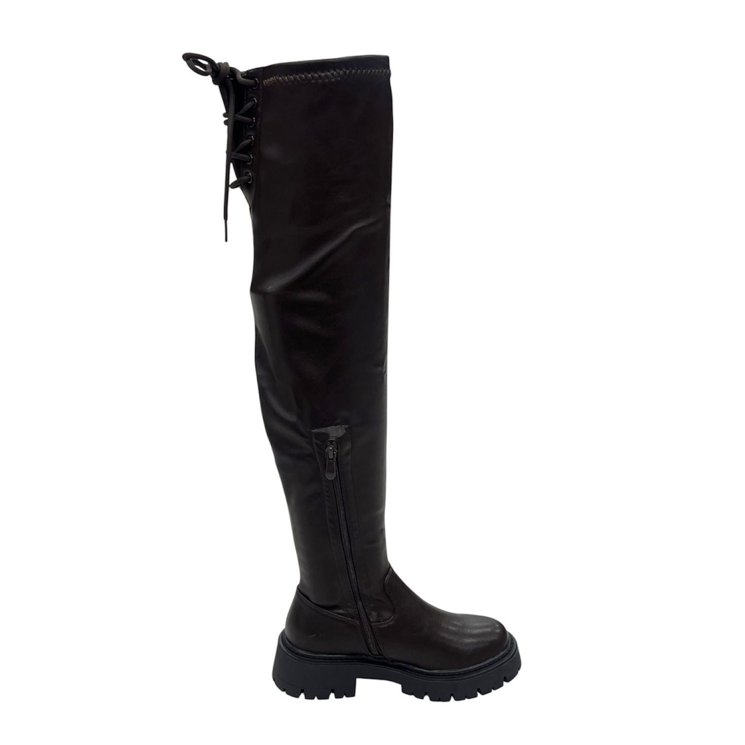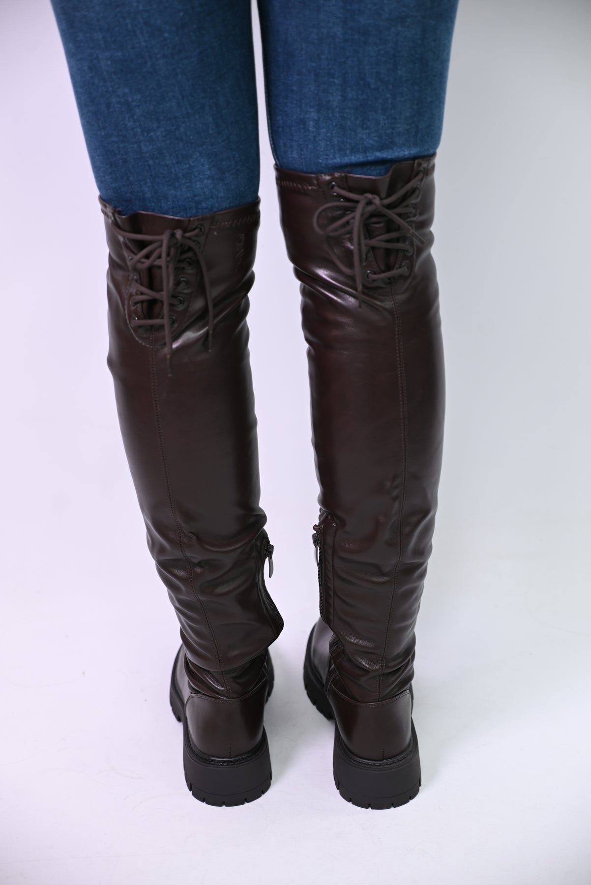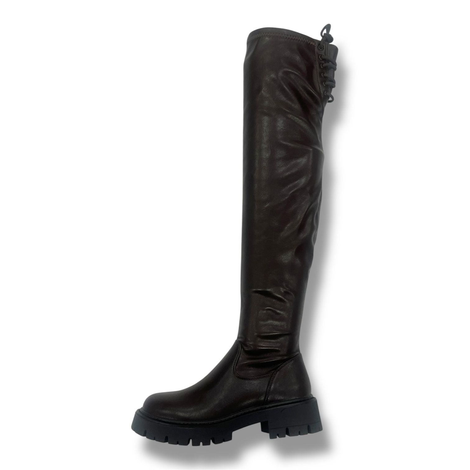 De Dual Terrain over-the-knee boots combineren urban edge met functionele flair. De diepe profielzool biedt grip en karakter, terwijl het slanke silhouet en de vetersluiting aan de achterkant zorgen voor een gestroomlijnde pasvorm. Verkrijgbaar in zwart en donkerbruin—twee tinten, één statement. Draag ze solo of als asymmetrisch paar voor een gedurfde twist.