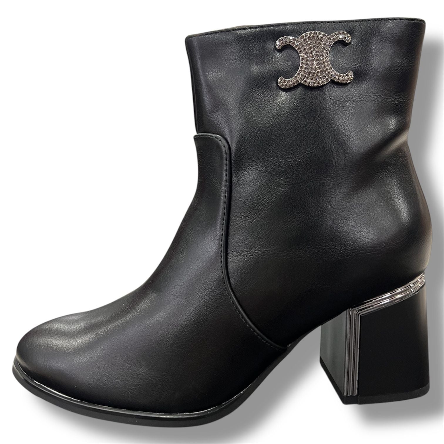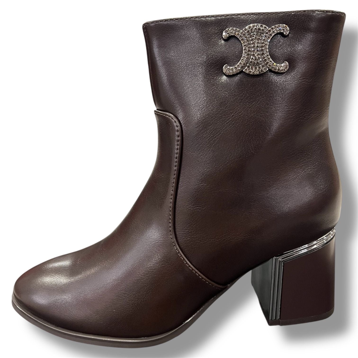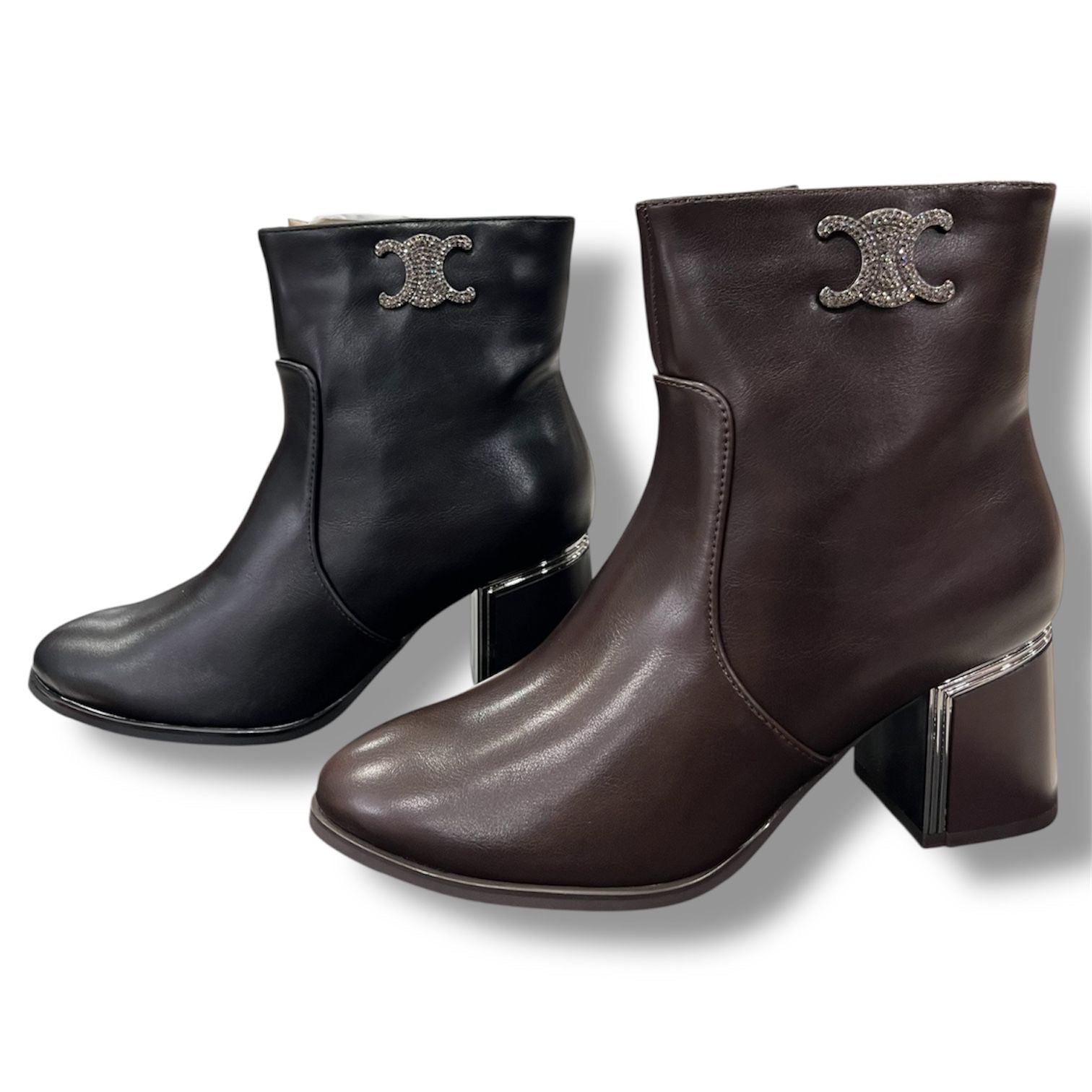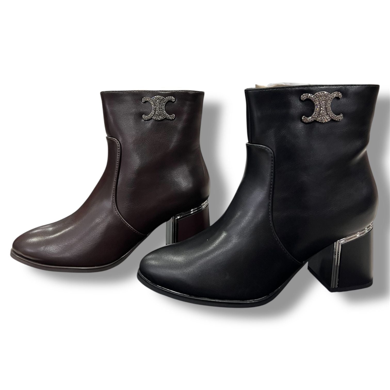 De Crescent Echo enkellaarsjes combineren moderne elegantie met subtiele glans. Het gestroomlijnde leer, de blokhak met metalen accent en het fonkelende embleem creëren een silhouet dat zowel krachtig als verfijnd is. Verkrijgbaar in diepbruin en klassiek zwart—twee tijdloze tinten die moeiteloos combineren met dag- en avondlooks. Een echo van stijl, voor wie durft te schitteren zonder te schreeuwen.