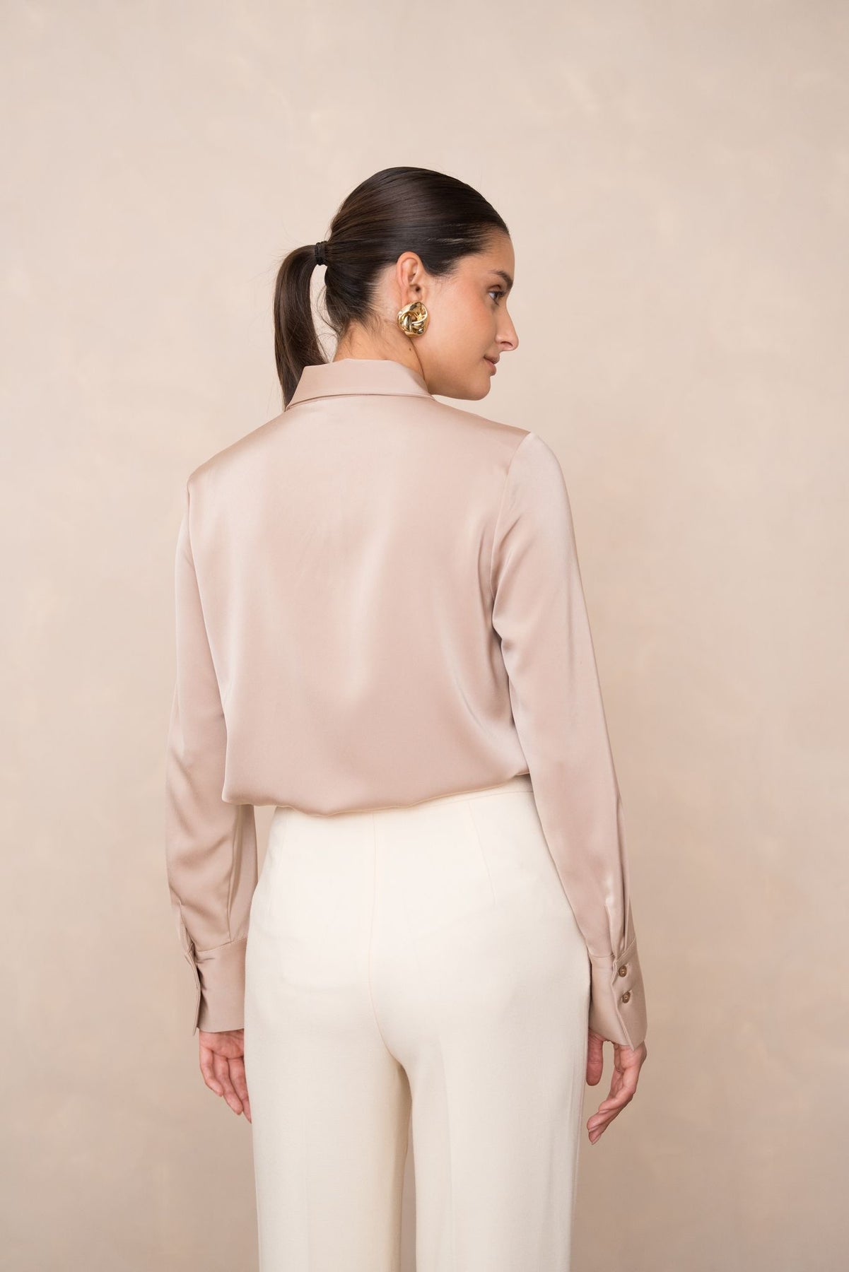 De Champagne Drift blouse vangt het licht en laat het dansen. Met haar satijnen glans, zachte champagnekleur en klassieke silhouet is deze blouse een ode aan zachtheid en stijl. Draag haar solo of onder een blazer voor een subtiele, luxueuze gloed.