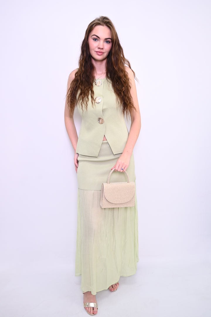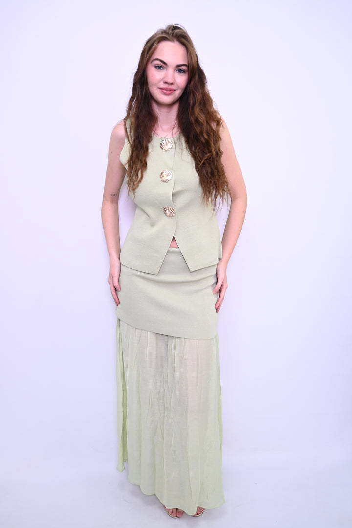 Deze elegante set bestaat uit een mouwloos vest met een diepe V-hals en drie decoratieve knopen in schelpstijl, gecombineerd met een lange rok die soepel valt. De rok heeft een subtiel transparant effect aan de onderzijde, wat zorgt voor een luchtige en vrouwelijke uitstraling. Ideaal voor warme dagen of een stijlvolle, casual look met een natuurlijke twist.