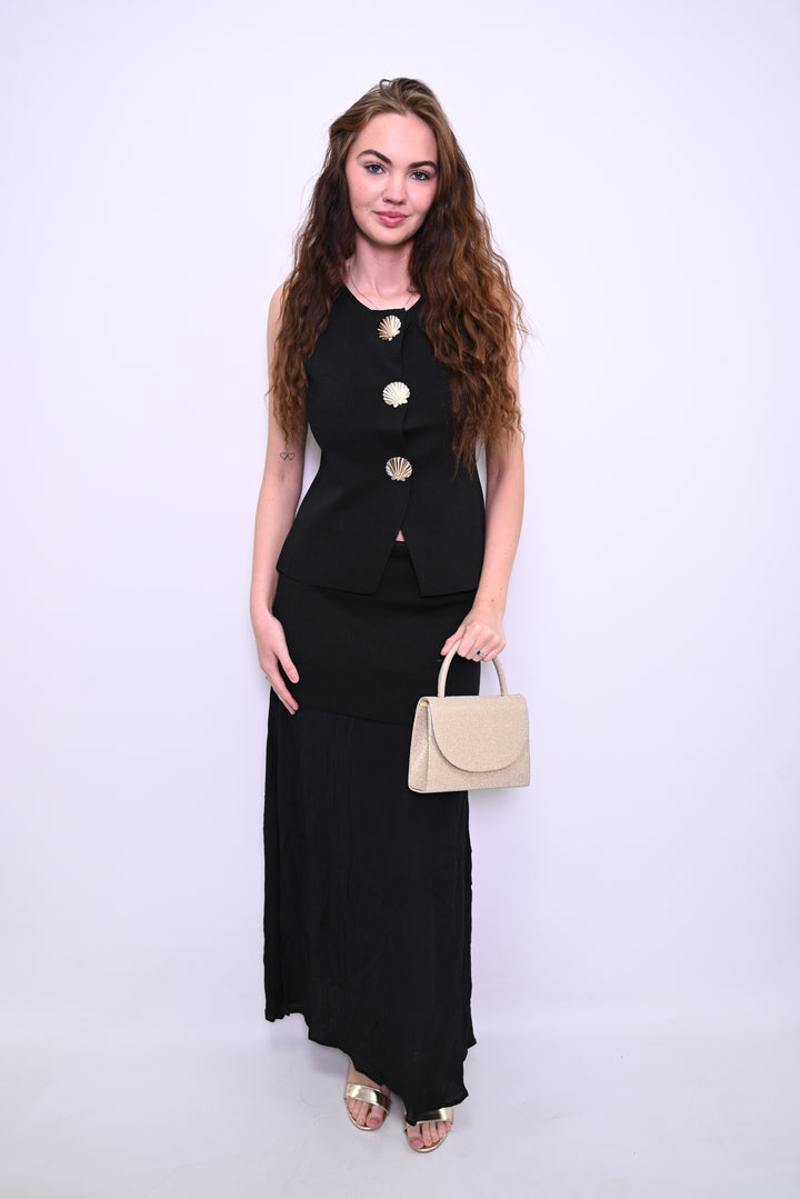 Tweedelige Set – Mouwloos Vest & Lange Rok met Schelpknoopdetail Y1241