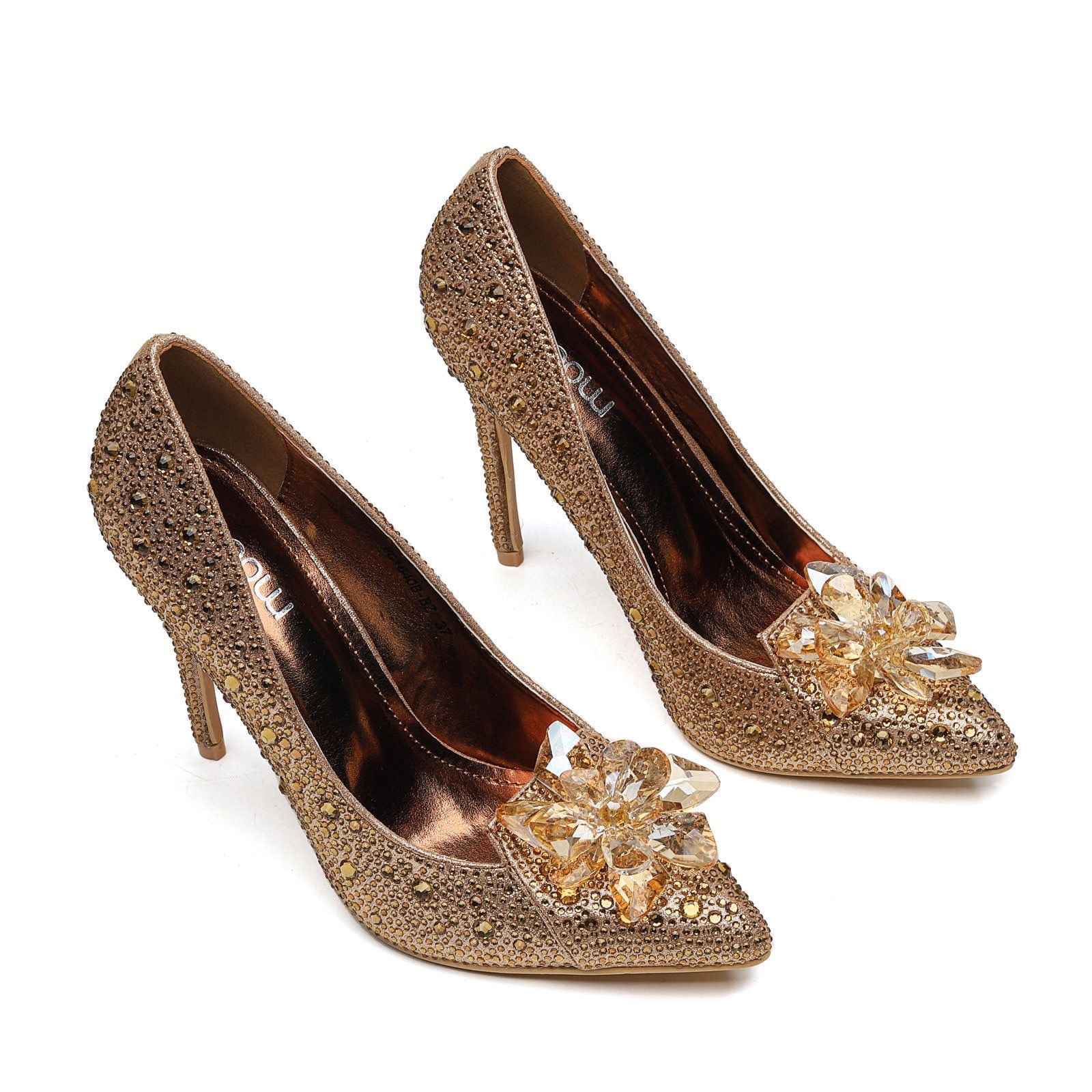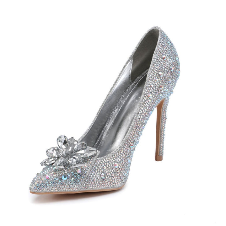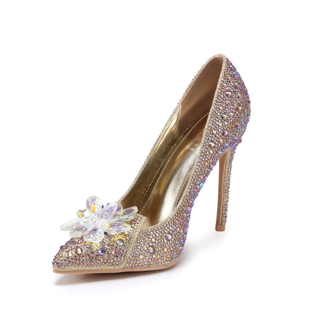 Stap stijlvol de spotlight in met deze adembenemende hoge hakken, afgewerkt met schitterende strass-steentjes en een elegante bloemvormige decoratie. Verkrijgbaar in vier verfijnde kleuren—goud, roze, zilver en een unieke goud-zilver combinatie—bieden deze hakken een perfecte mix van glamour en klasse.