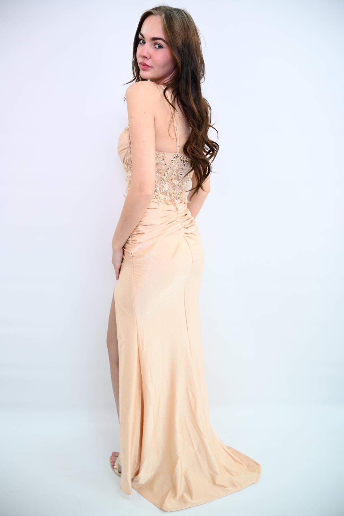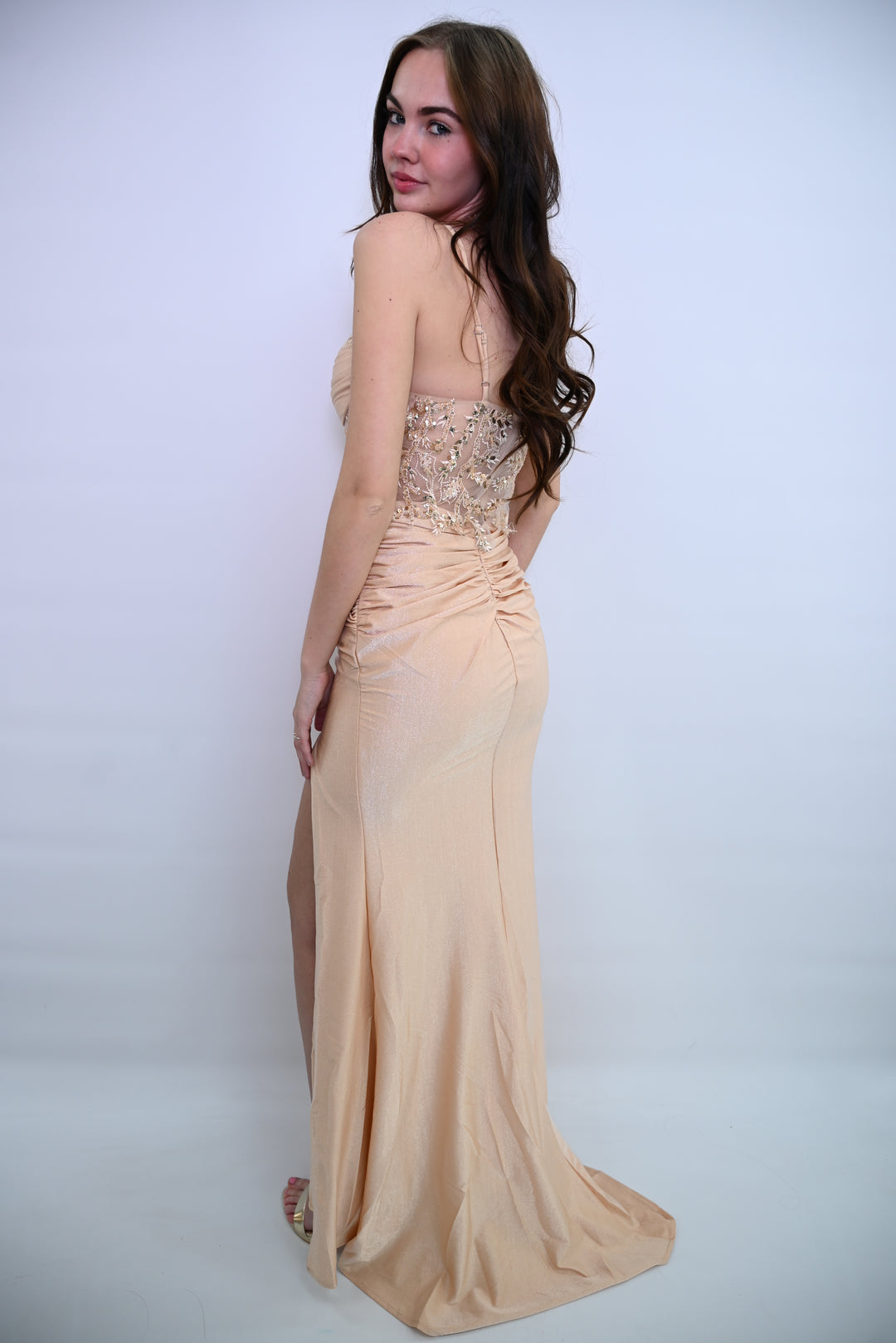 Deze avondjurk straalt een tijdloze, luxueuze allure uit en is een perfecte keuze voor bijzondere gelegenheden. De verfijnde kanten bodice voegt een romantische touch toe, terwijl de subtiele parelbandjes elegantie en verfijning benadrukken. De vloeiende rok met hoge split zorgt voor een sierlijke beweging en een gracieuze uitstraling. Een onweerstaanbare combinatie van klasse en stijl, ideaal voor formele evenementen waar je wilt schitteren.
