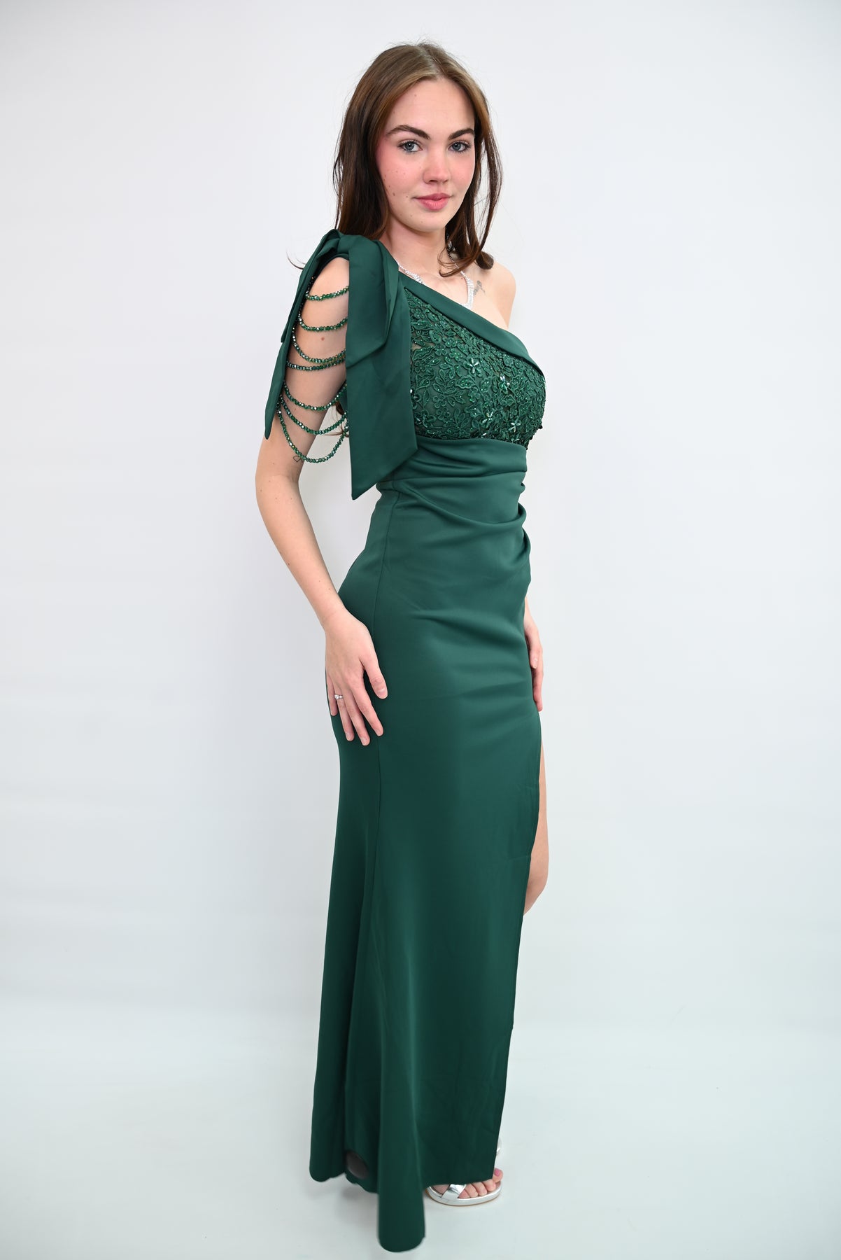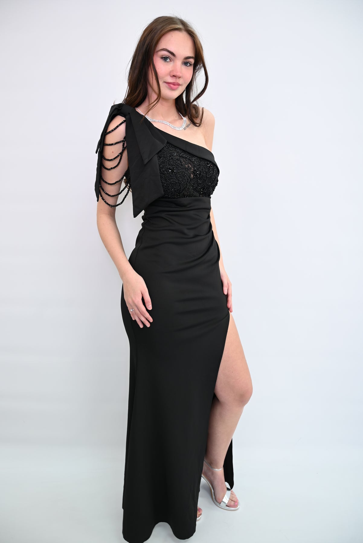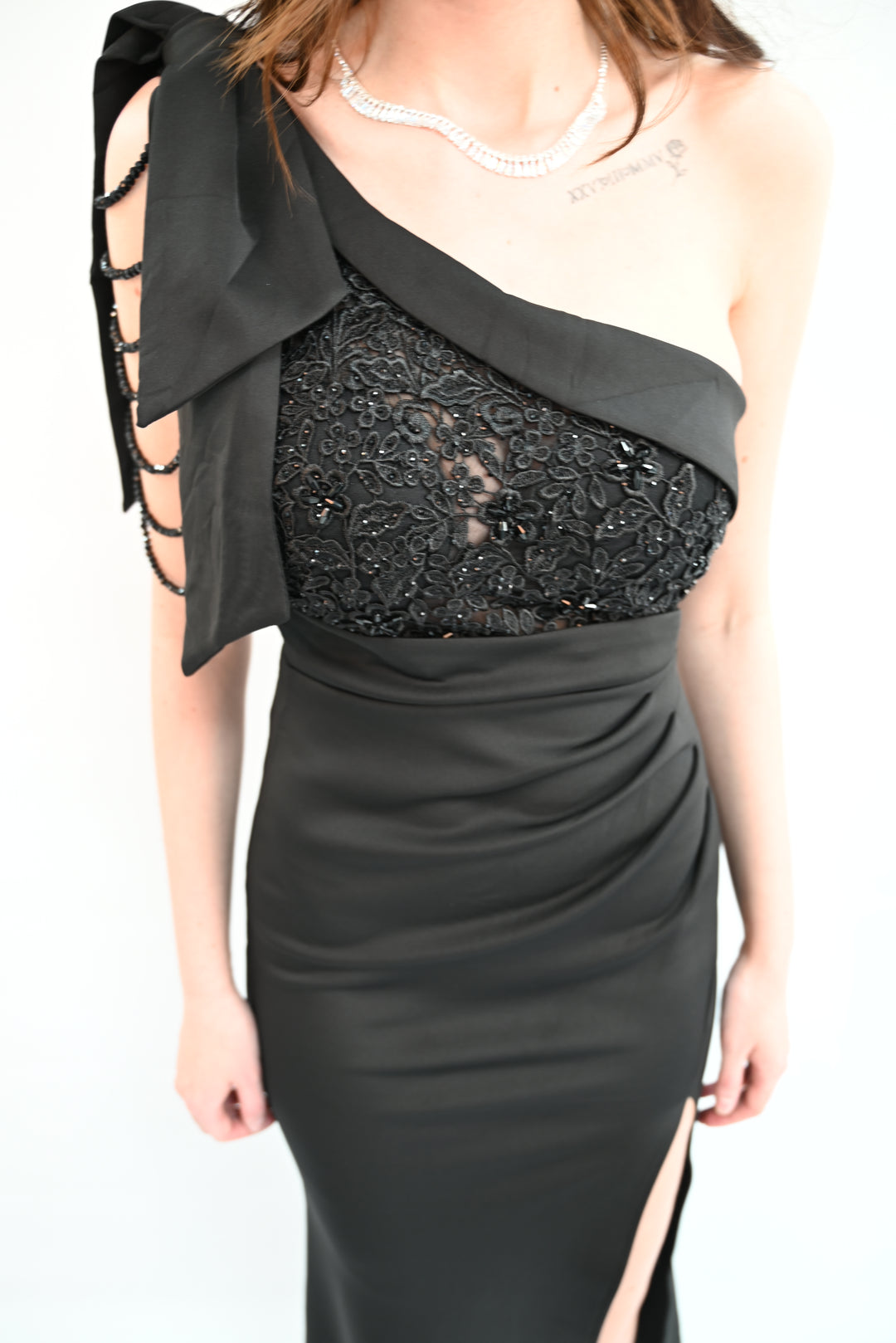 Een verfijnde avondjurk die elegantie en klasse uitstraalt. De kanten bovenkant, subtiele parelbandjes en vloeiende rok met hoge split maken deze jurk perfect voor speciale gelegenheden en formele evenementen. Tijdloos en stijlvol – een prachtige aanvulling op elke garderobe.