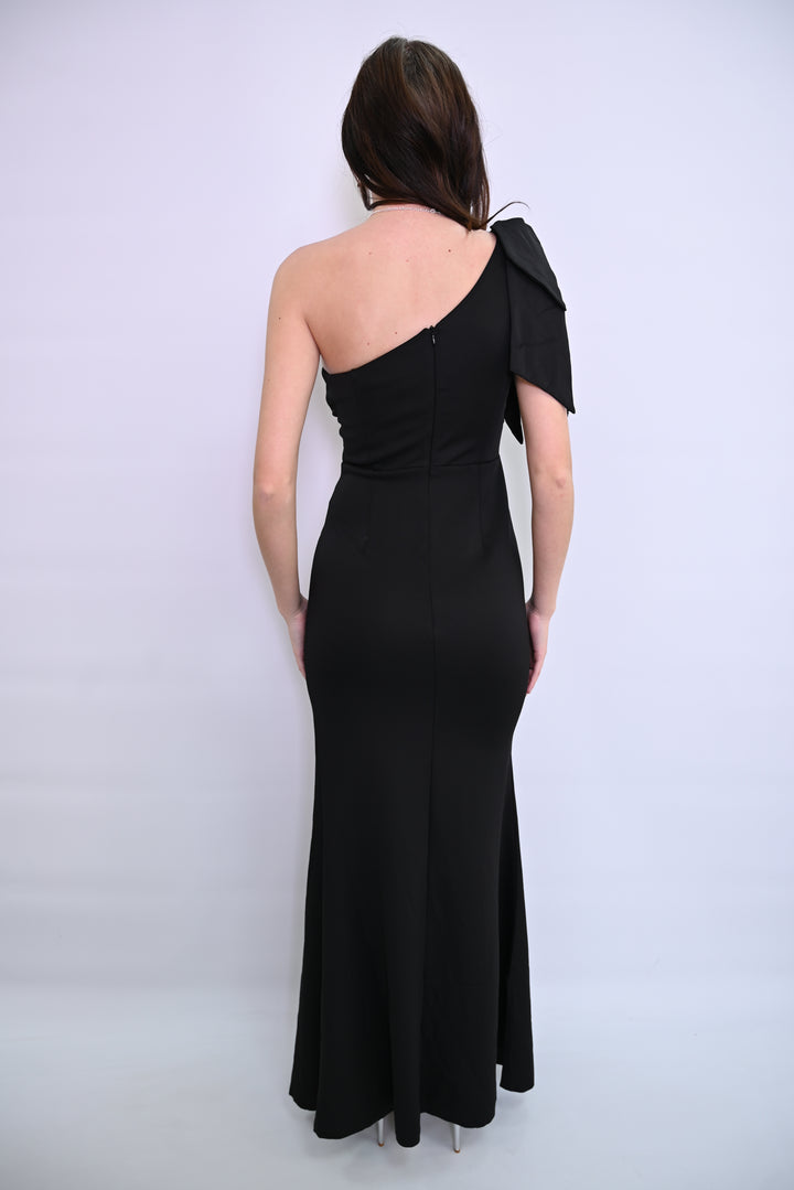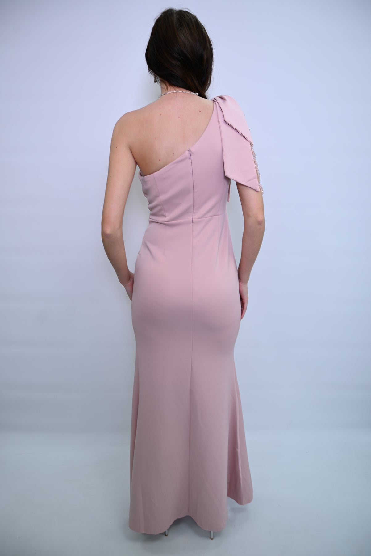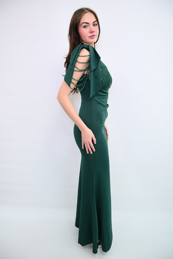 Een verfijnde avondjurk die elegantie en klasse uitstraalt. De kanten bovenkant, subtiele parelbandjes en vloeiende rok met hoge split maken deze jurk perfect voor speciale gelegenheden en formele evenementen. Tijdloos en stijlvol – een prachtige aanvulling op elke garderobe.