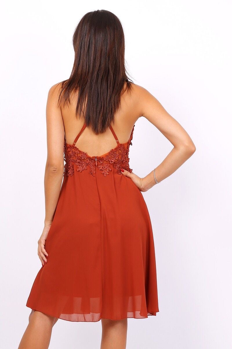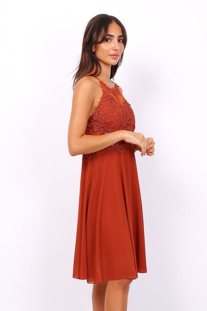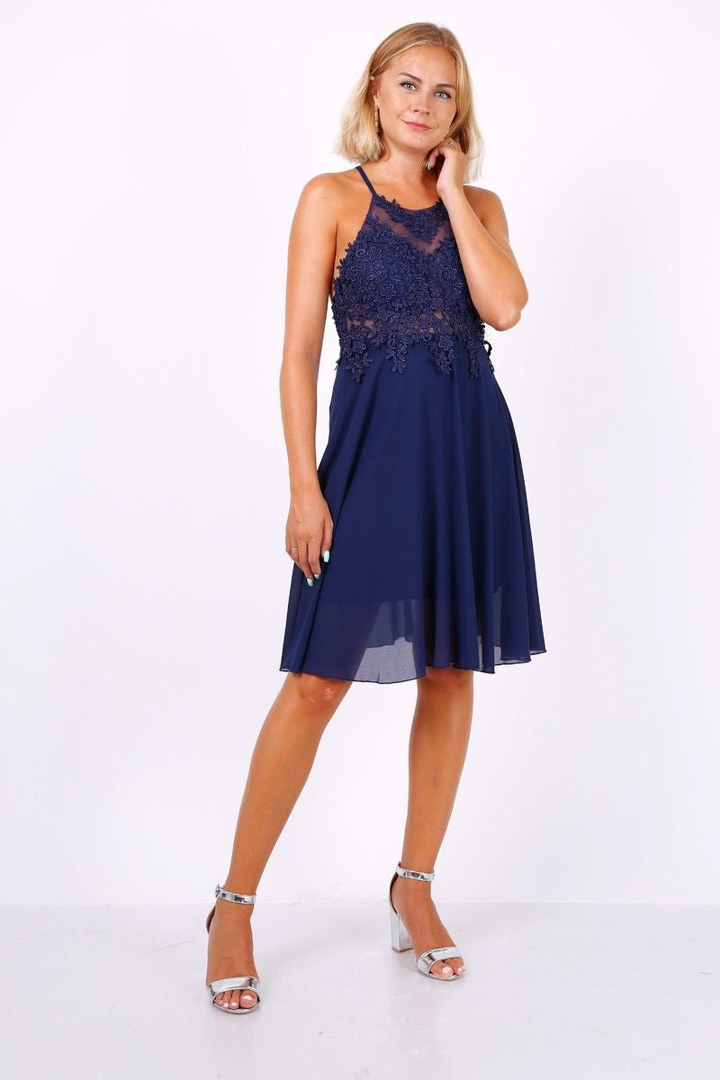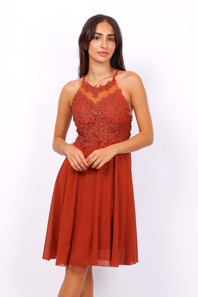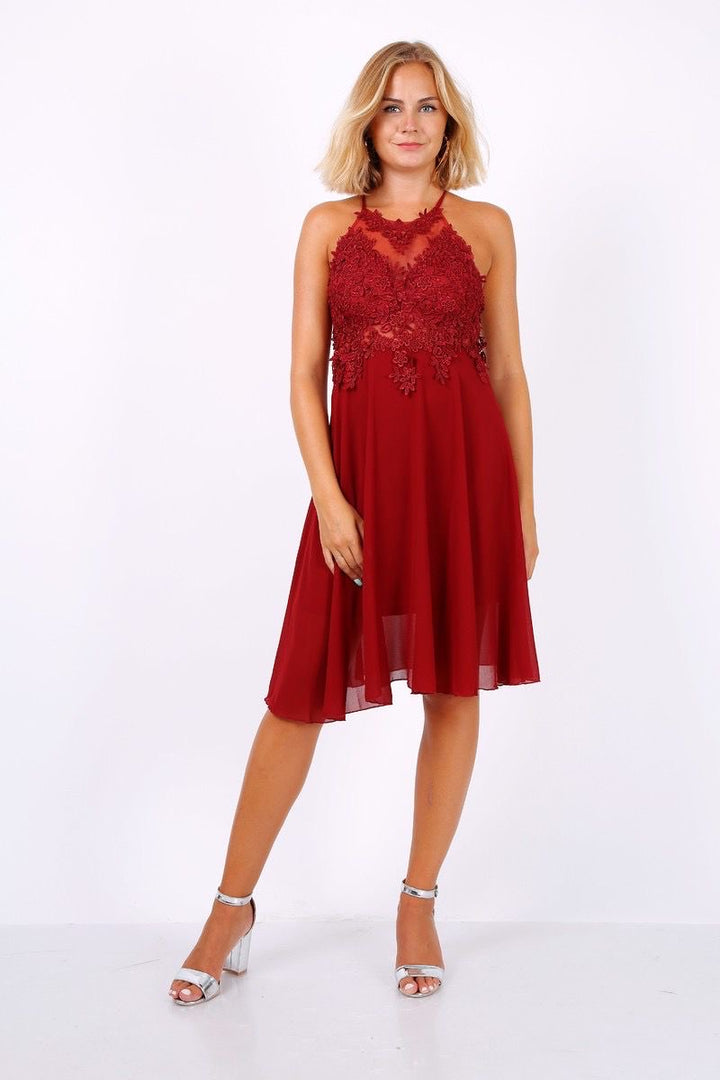 Deze elegante cocktailjurk combineert een luchtige chiffon A-lijn rok met een prachtig geborduurde bovenkant voor een verfijnde, vrouwelijke uitstraling. De geborduurde details op het bovenlijfje geven de jurk een delicate en luxe uitstraling, terwijl de vloeiende chiffon rok vanaf de taille naar beneden valt en zorgt voor een flatterend silhouet. De A-lijn pasvorm benadrukt de taille en geeft een speelse, elegante look die ideaal is voor formele evenementen, bruiloften of feestelijke gelegenheden. Deze jurk straalt verfijning uit met een subtiele balans tussen romantiek en elegantie.