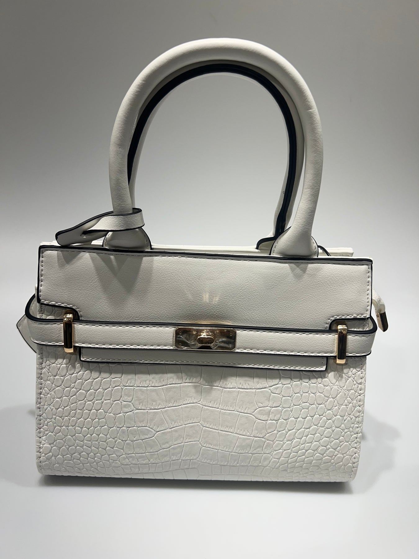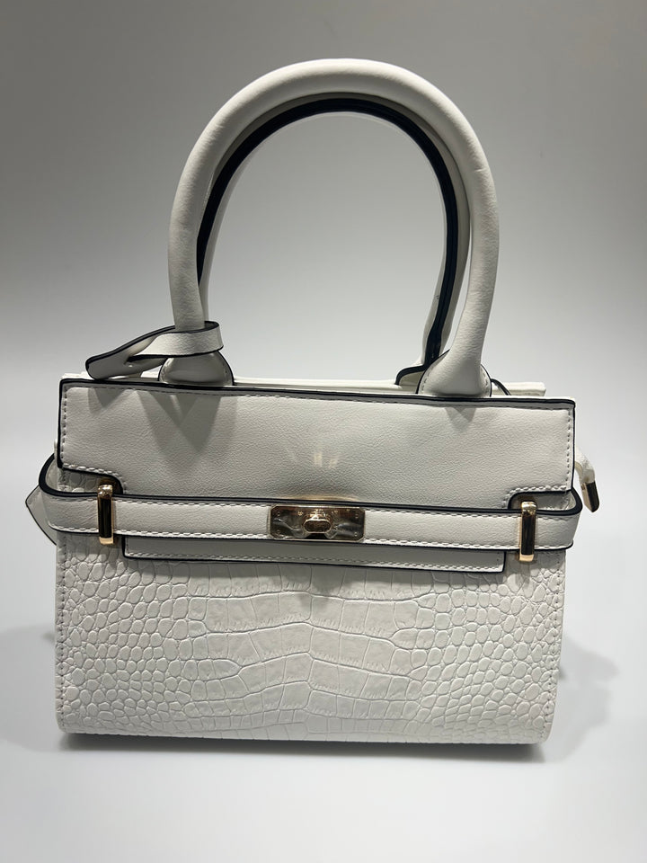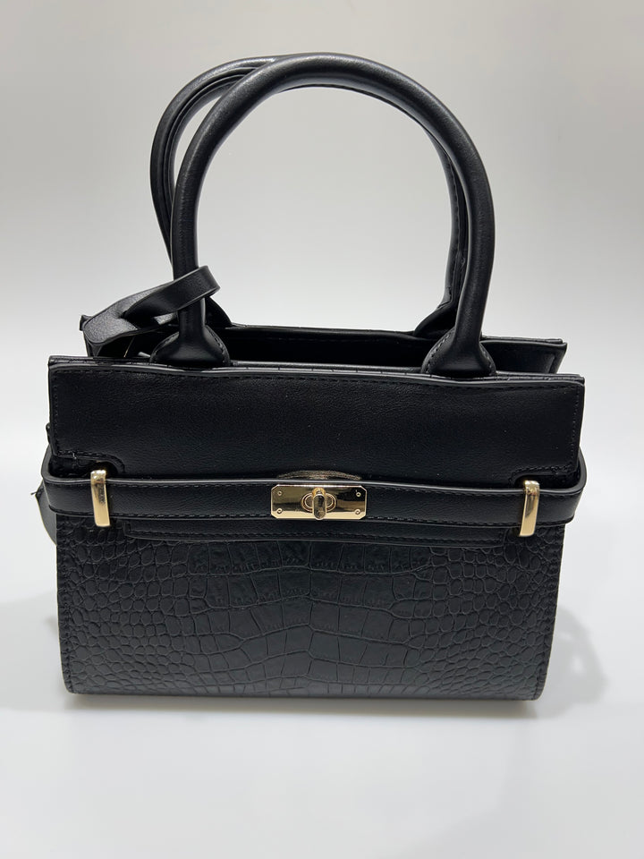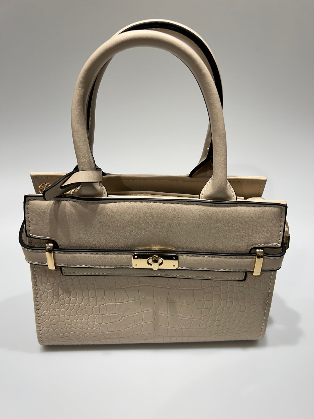 Deze stijlvolle handtas straalt klasse en verfijning uit. Het ontwerp combineert een gladde bovenzijde met een gestructureerde onderkant die een luxe uitstraling geeft. De stevige handvatten en de flap met een metalen sluiting bieden zowel praktische functionaliteit als een chique afwerking. De subtiele goudkleurige details maken het geheel compleet en zorgen voor een tijdloos accessoire dat perfect past bij diverse gelegenheden.