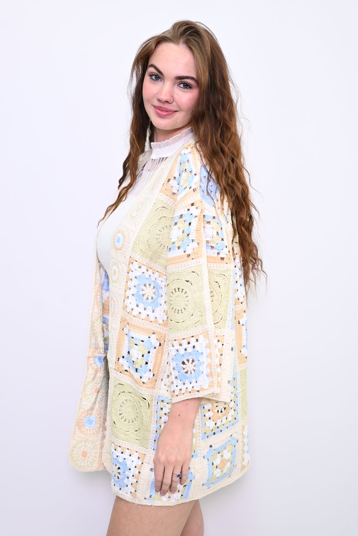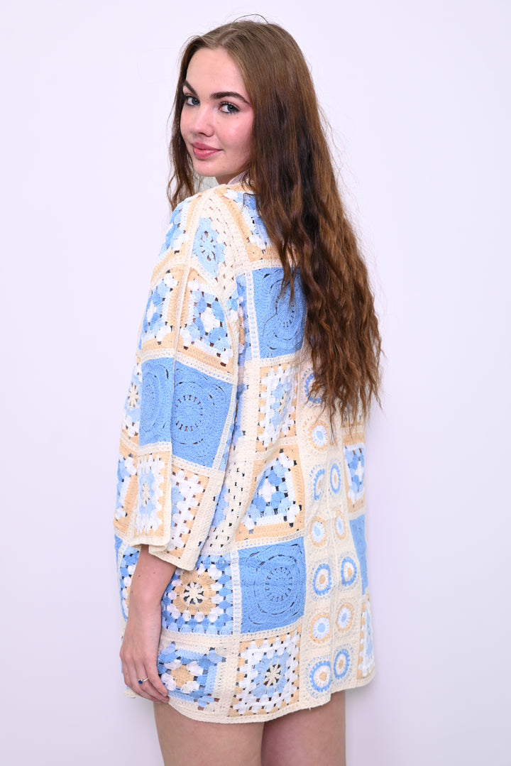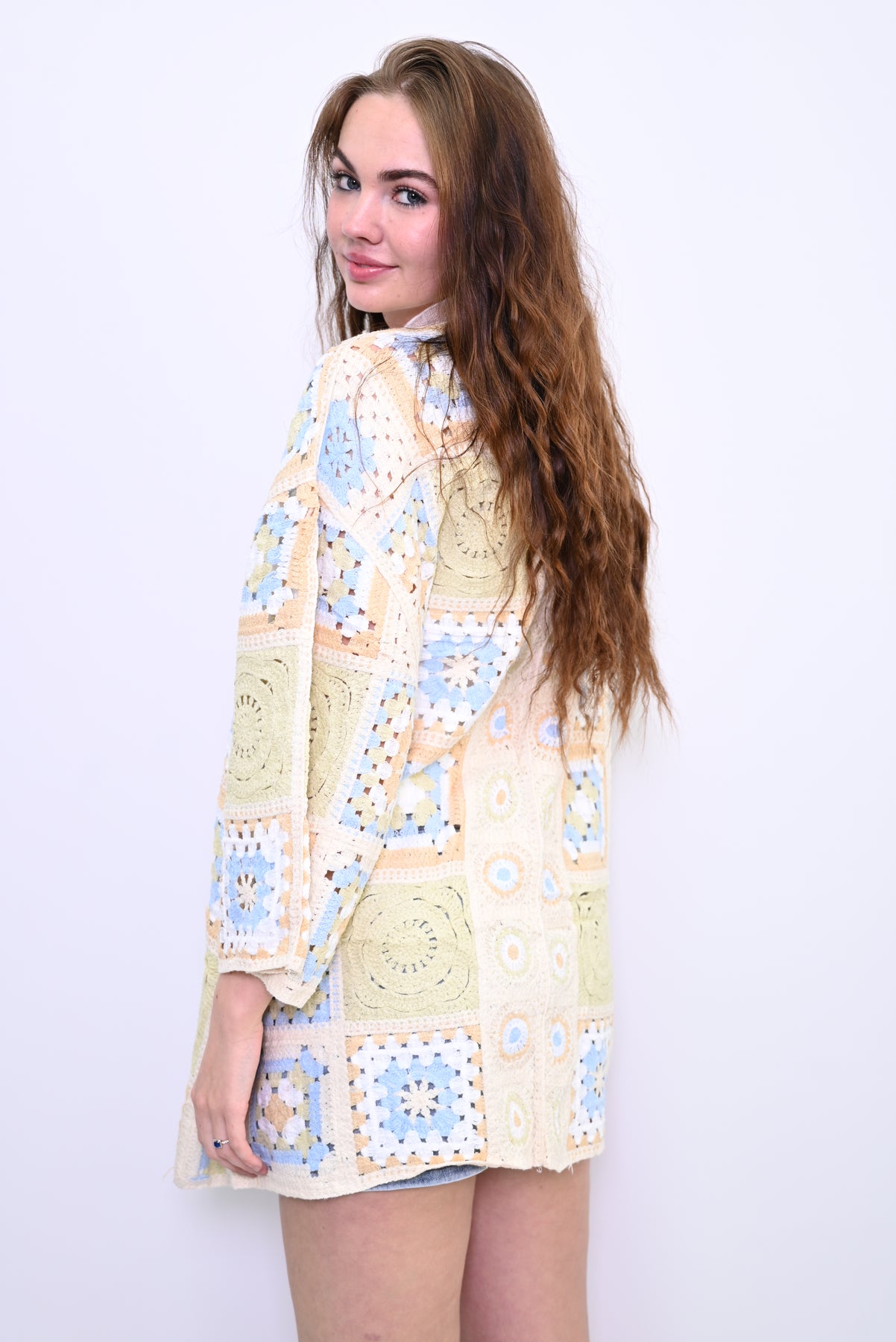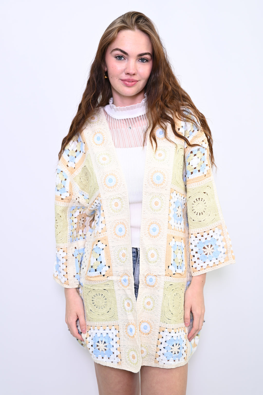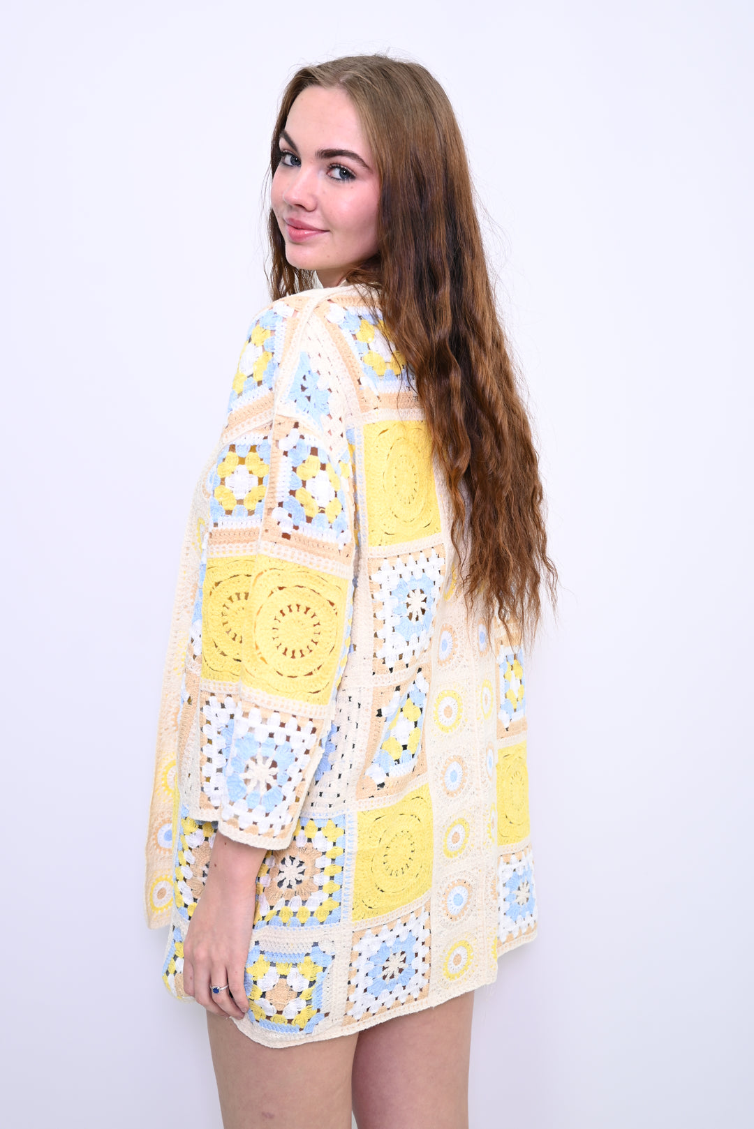 Deze handgehaakte vest is een waar kunstwerk van kleur en textuur. Elk vierkant is uniek, met speelse patronen zoals bloemen, cirkels en sterren in een harmonieus patchworkdesign. De losse pasvorm en wijde mouwen geven het vest een relaxte boho-uitstraling, perfect voor festivals, stranddagen of een creatieve touch aan je dagelijkse outfit. Draag het over een topje en denim shorts voor een moeiteloos stijlvolle look.