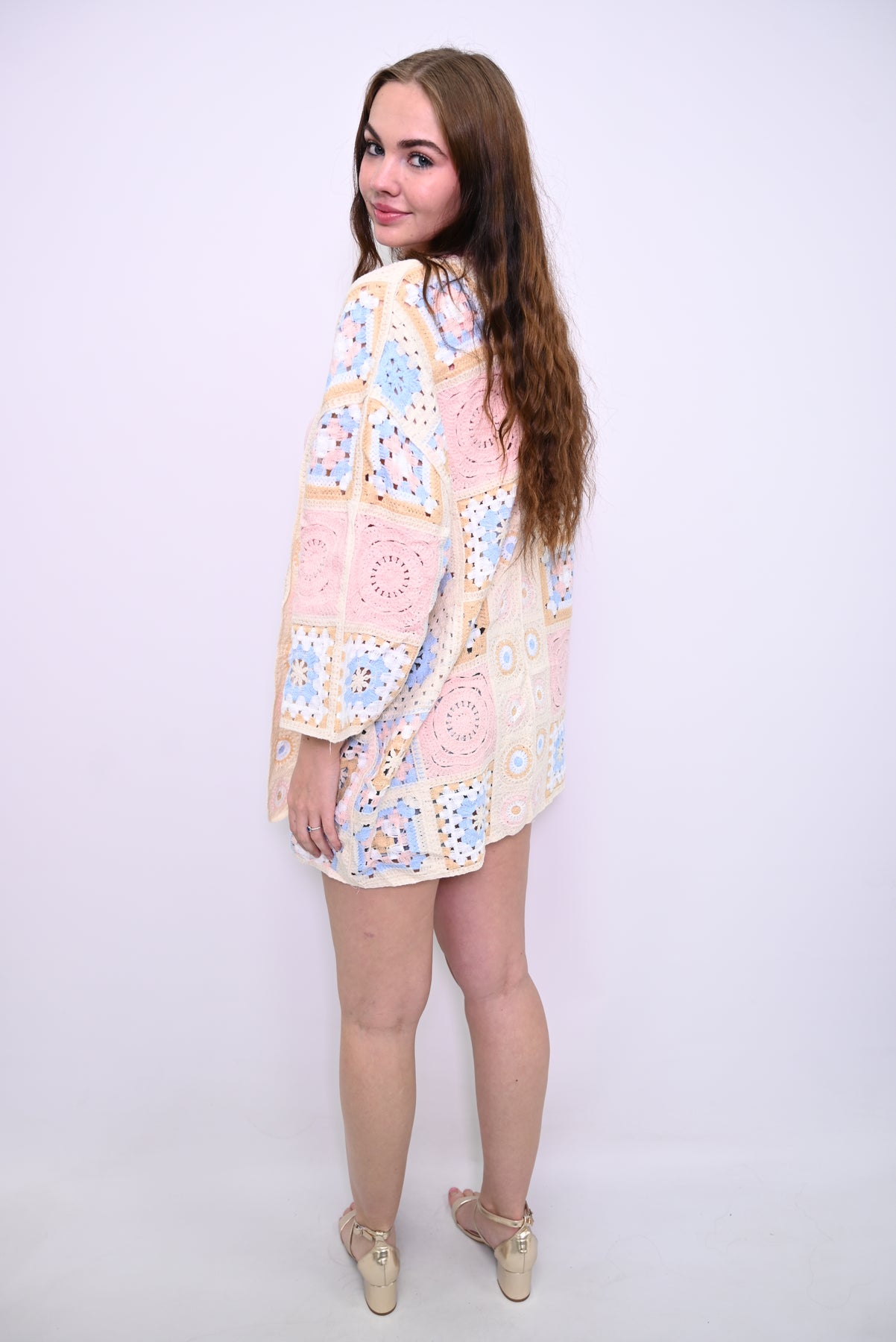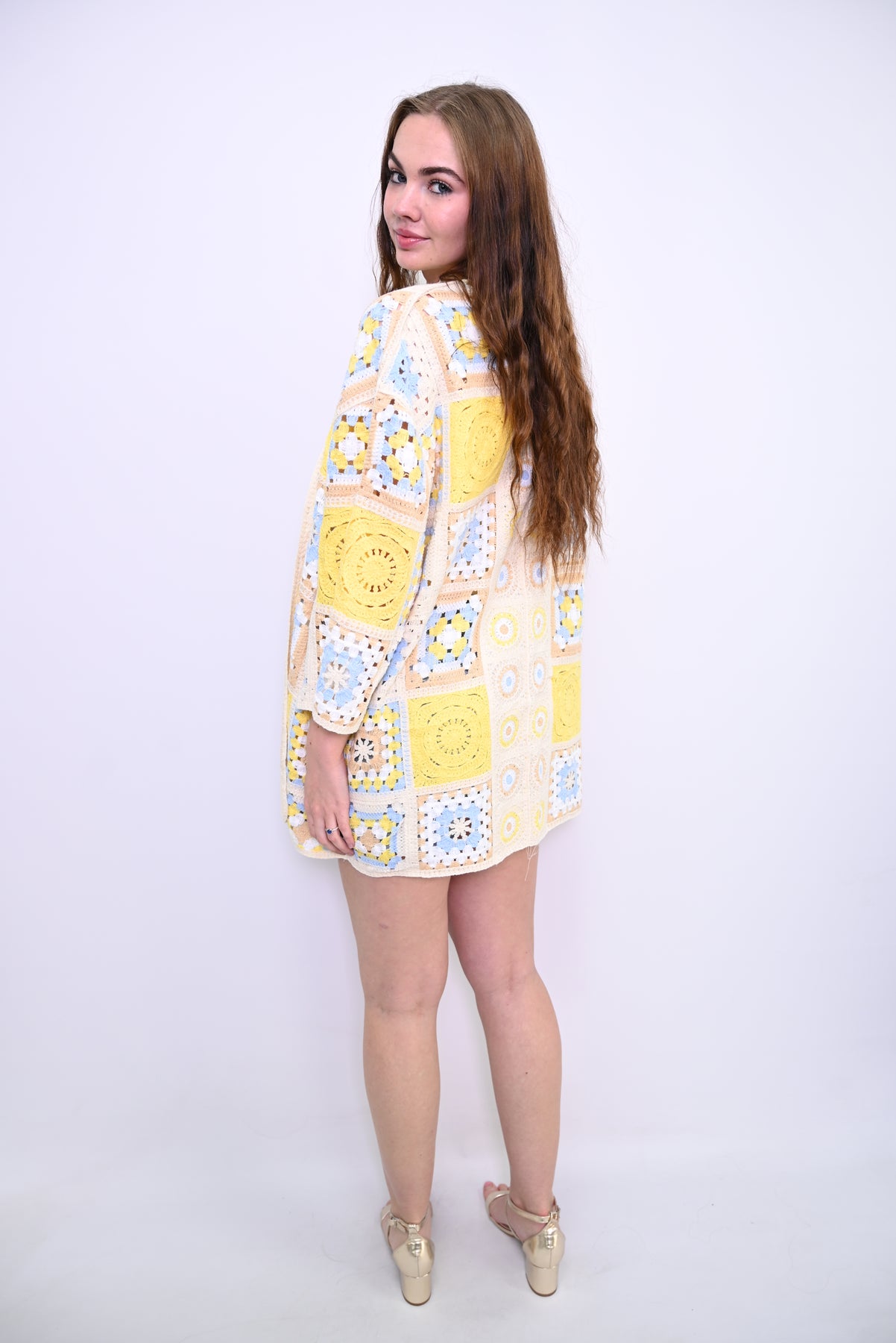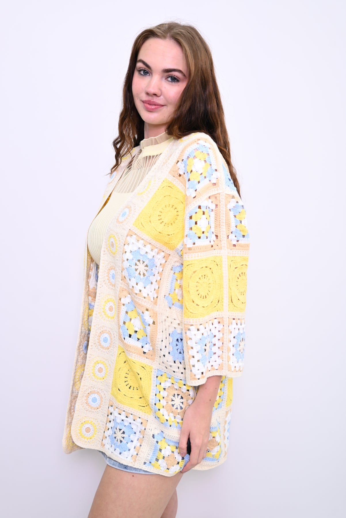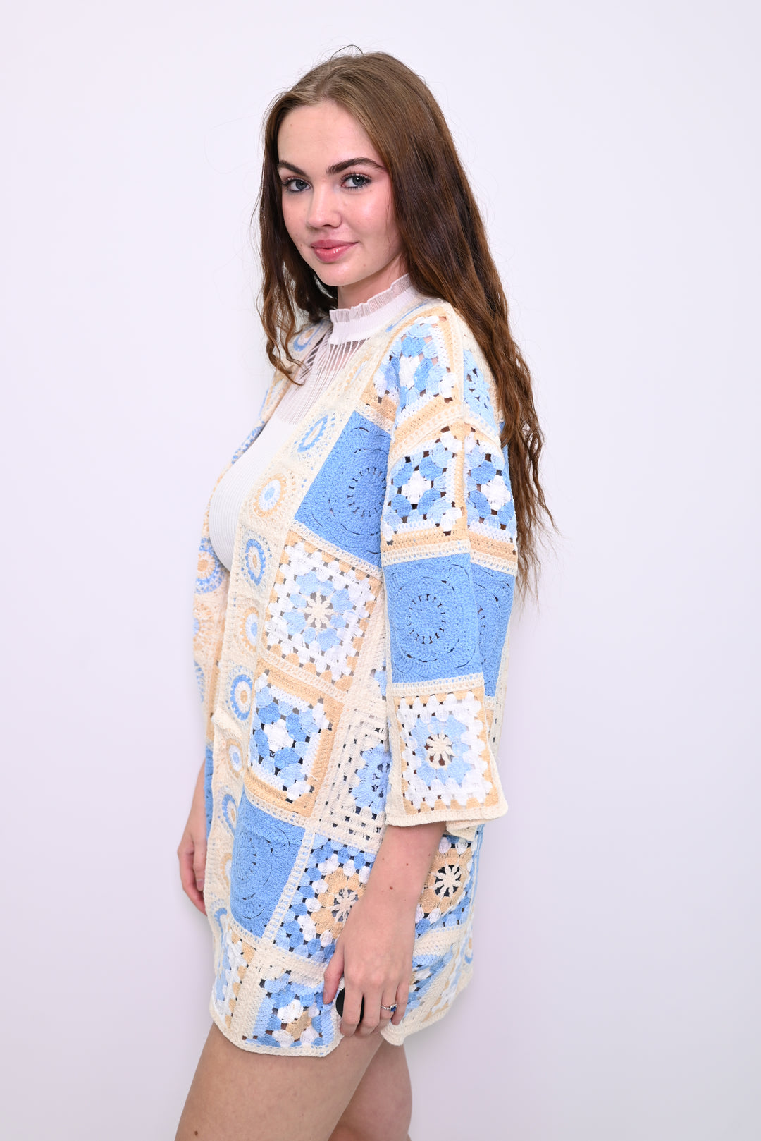 Deze handgehaakte vest is een waar kunstwerk van kleur en textuur. Elk vierkant is uniek, met speelse patronen zoals bloemen, cirkels en sterren in een harmonieus patchworkdesign. De losse pasvorm en wijde mouwen geven het vest een relaxte boho-uitstraling, perfect voor festivals, stranddagen of een creatieve touch aan je dagelijkse outfit. Draag het over een topje en denim shorts voor een moeiteloos stijlvolle look.