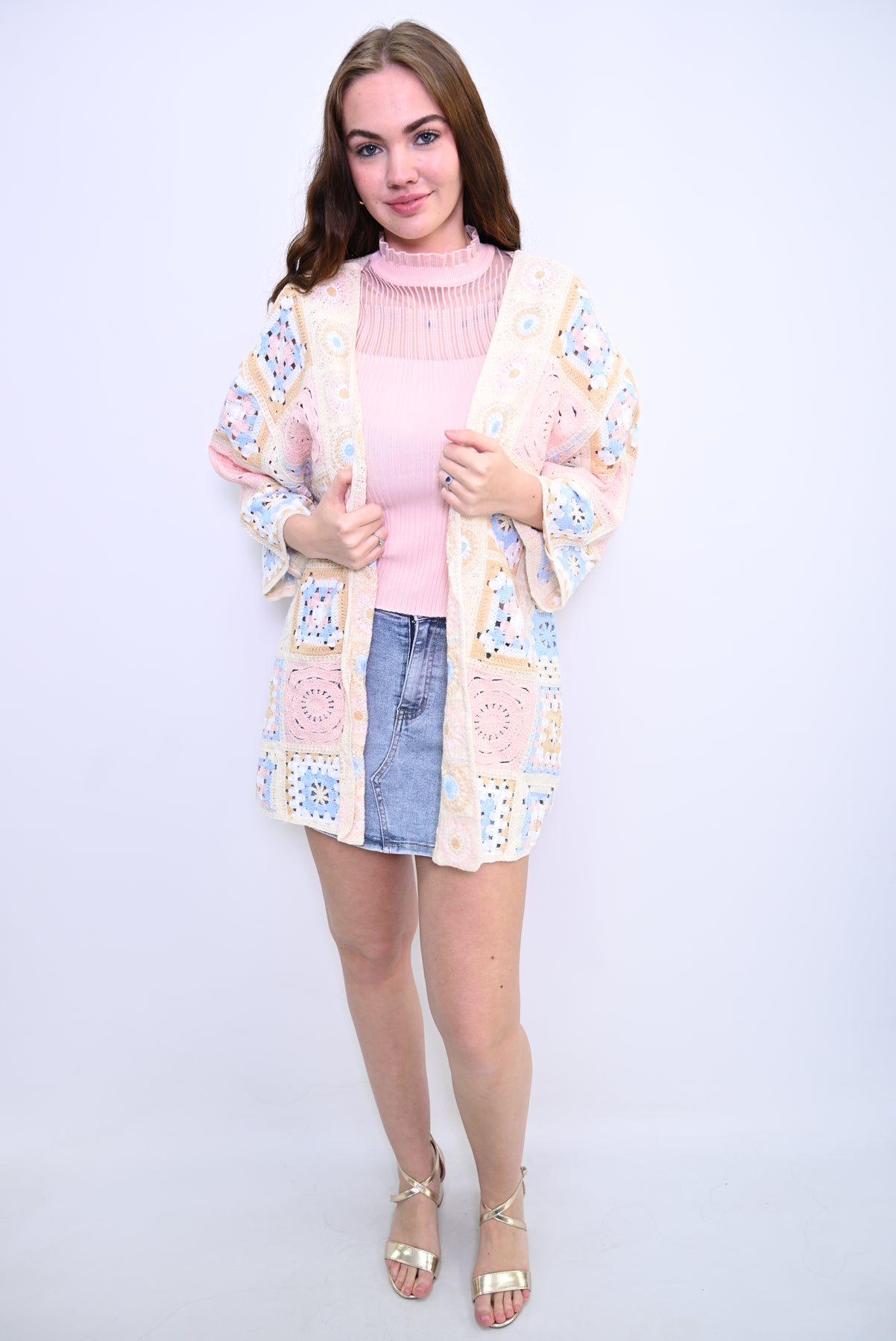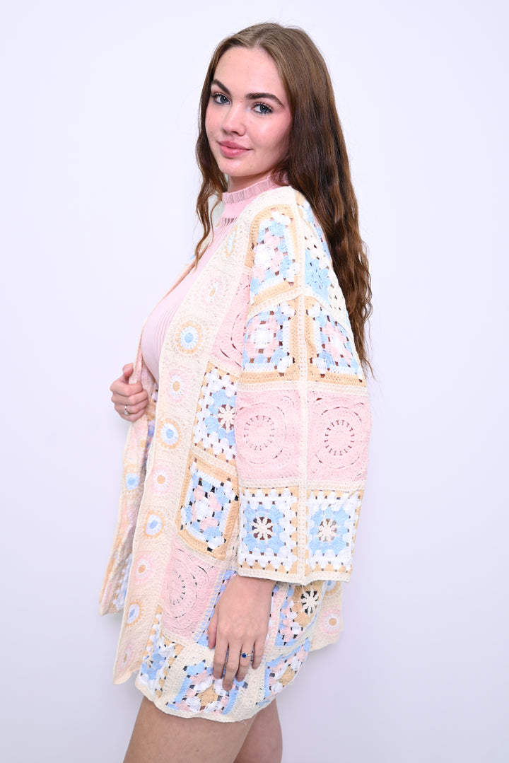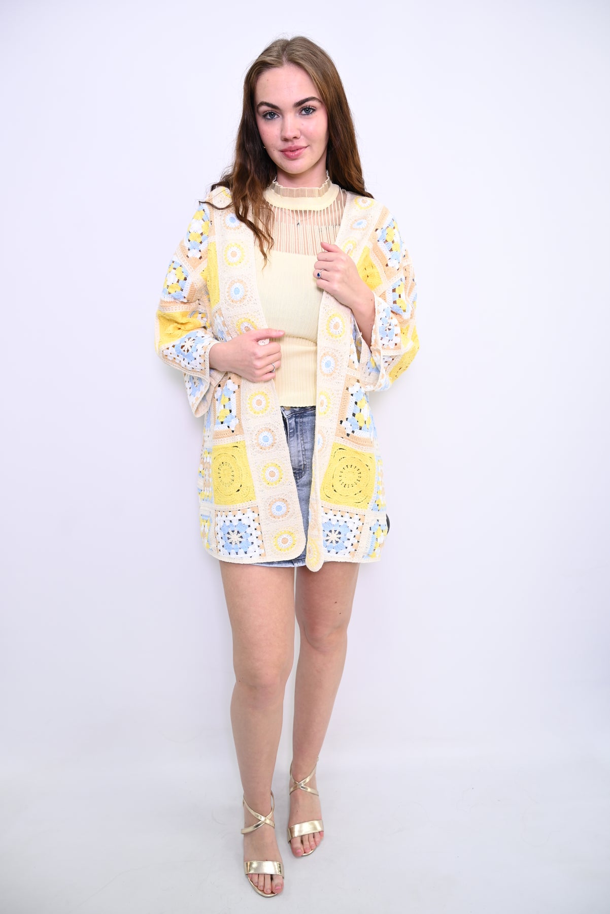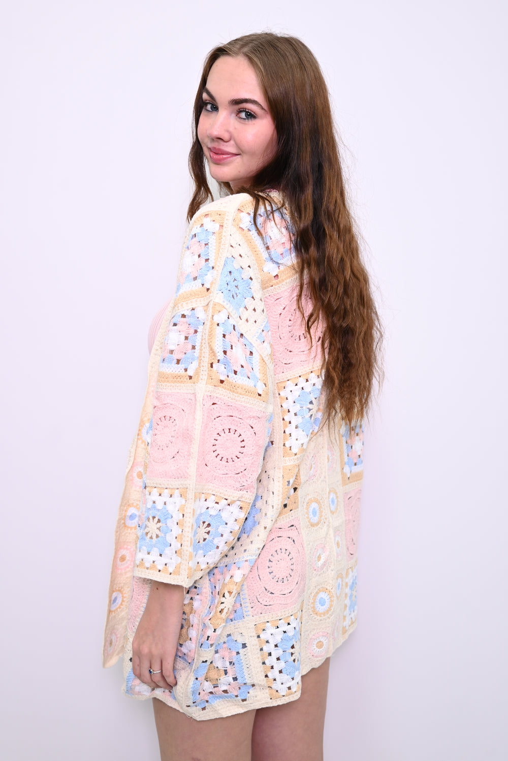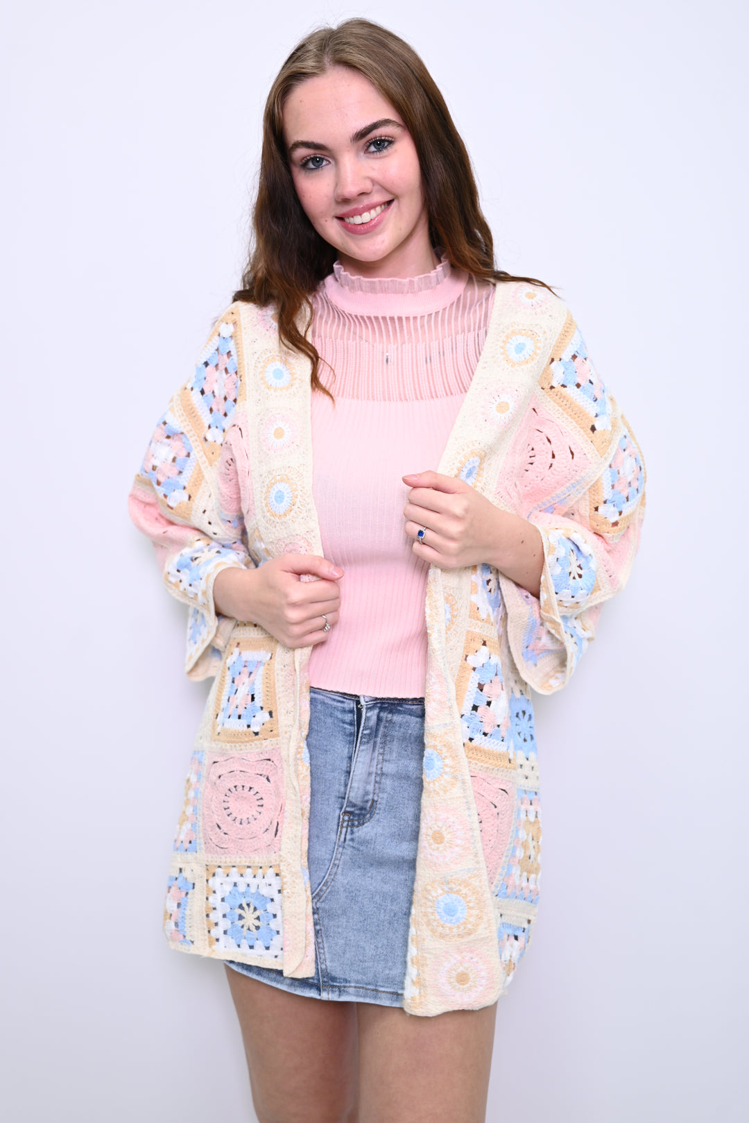 Deze handgehaakte vest is een waar kunstwerk van kleur en textuur. Elk vierkant is uniek, met speelse patronen zoals bloemen, cirkels en sterren in een harmonieus patchworkdesign. De losse pasvorm en wijde mouwen geven het vest een relaxte boho-uitstraling, perfect voor festivals, stranddagen of een creatieve touch aan je dagelijkse outfit. Draag het over een topje en denim shorts voor een moeiteloos stijlvolle look.