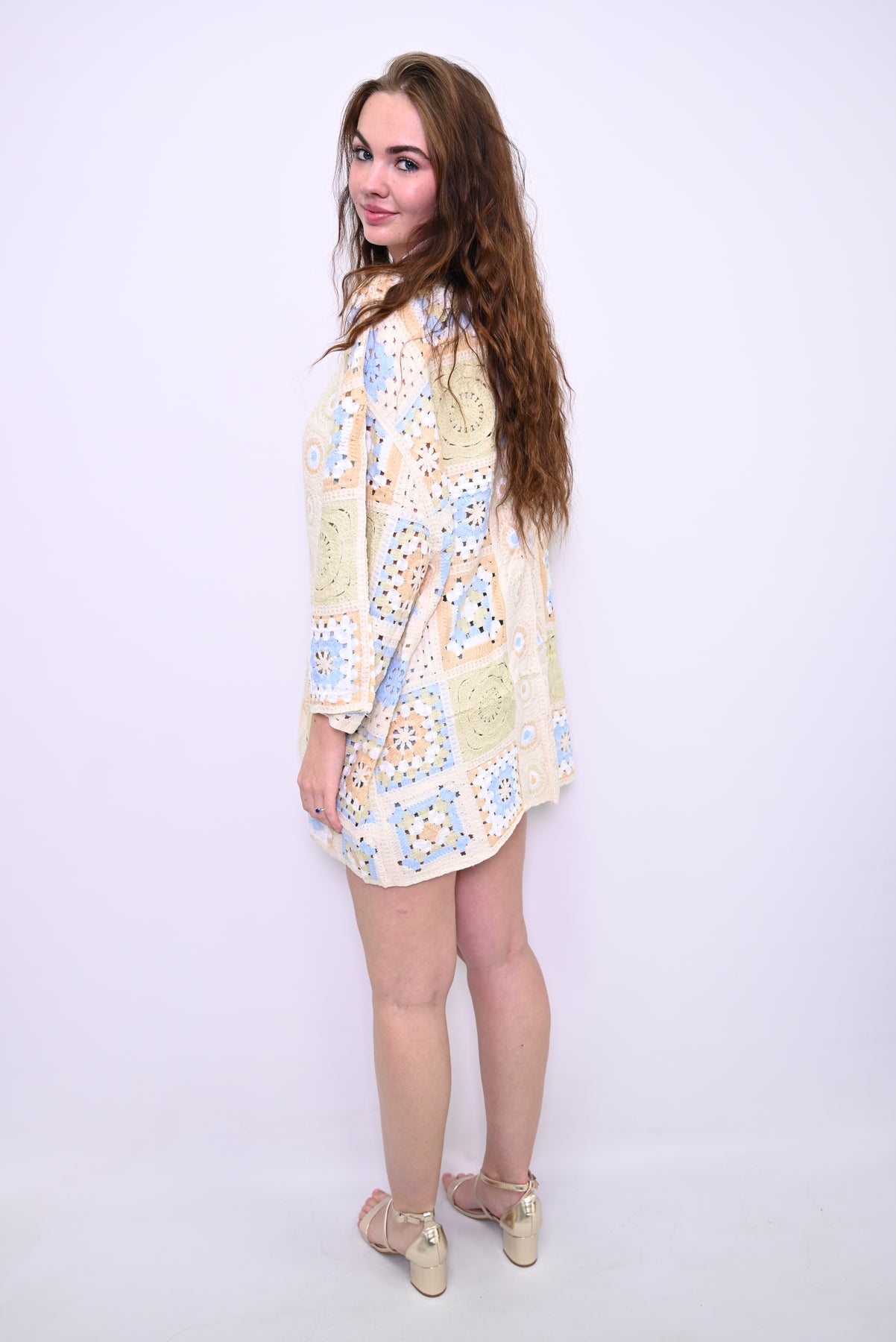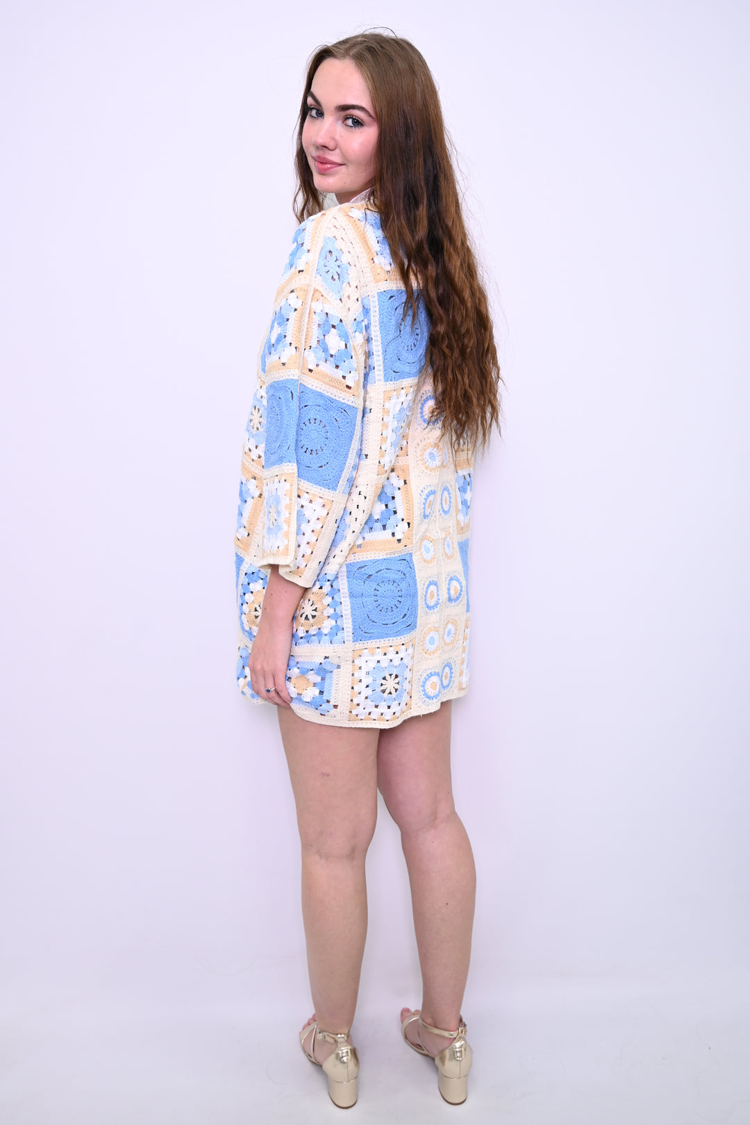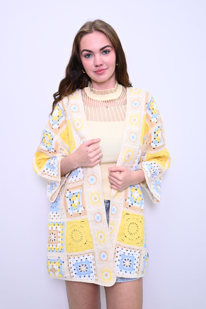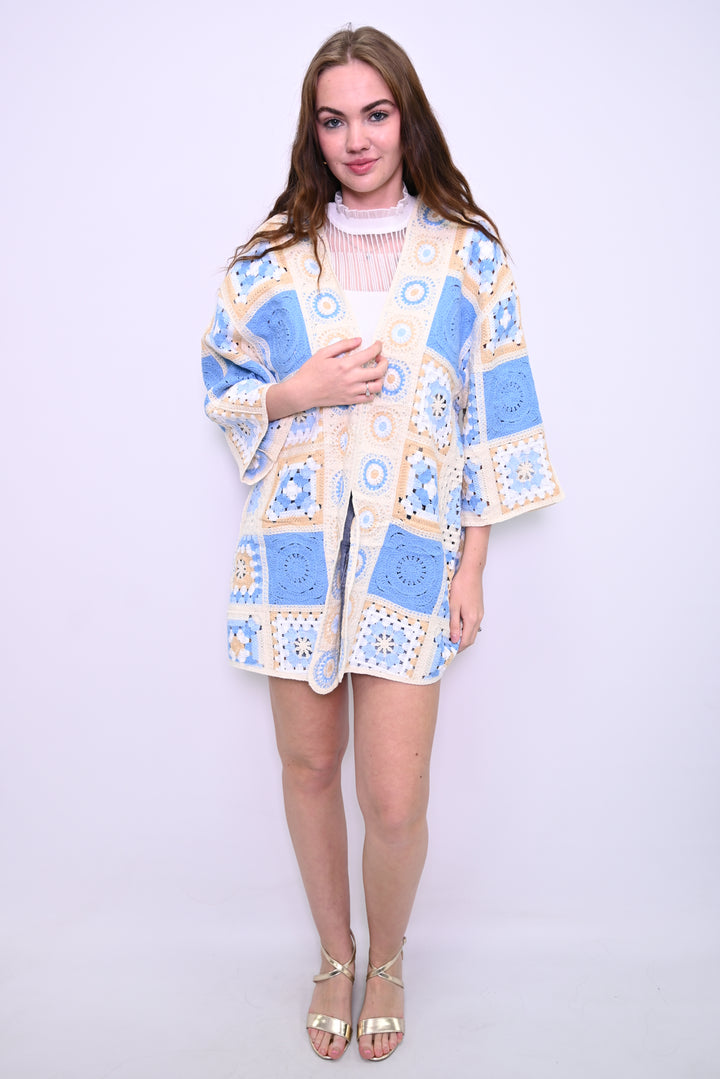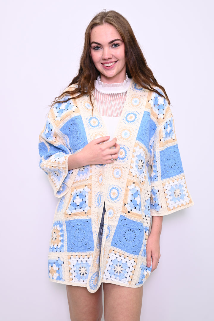 Deze handgehaakte vest is een waar kunstwerk van kleur en textuur. Elk vierkant is uniek, met speelse patronen zoals bloemen, cirkels en sterren in een harmonieus patchworkdesign. De losse pasvorm en wijde mouwen geven het vest een relaxte boho-uitstraling, perfect voor festivals, stranddagen of een creatieve touch aan je dagelijkse outfit. Draag het over een topje en denim shorts voor een moeiteloos stijlvolle look.