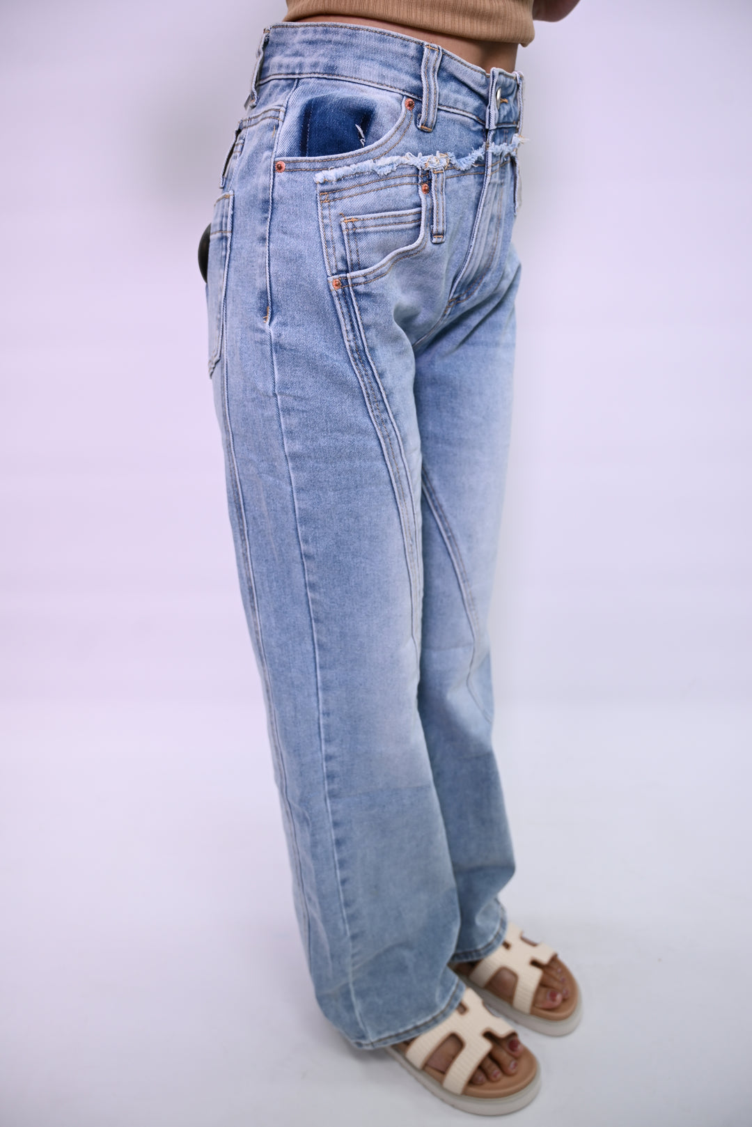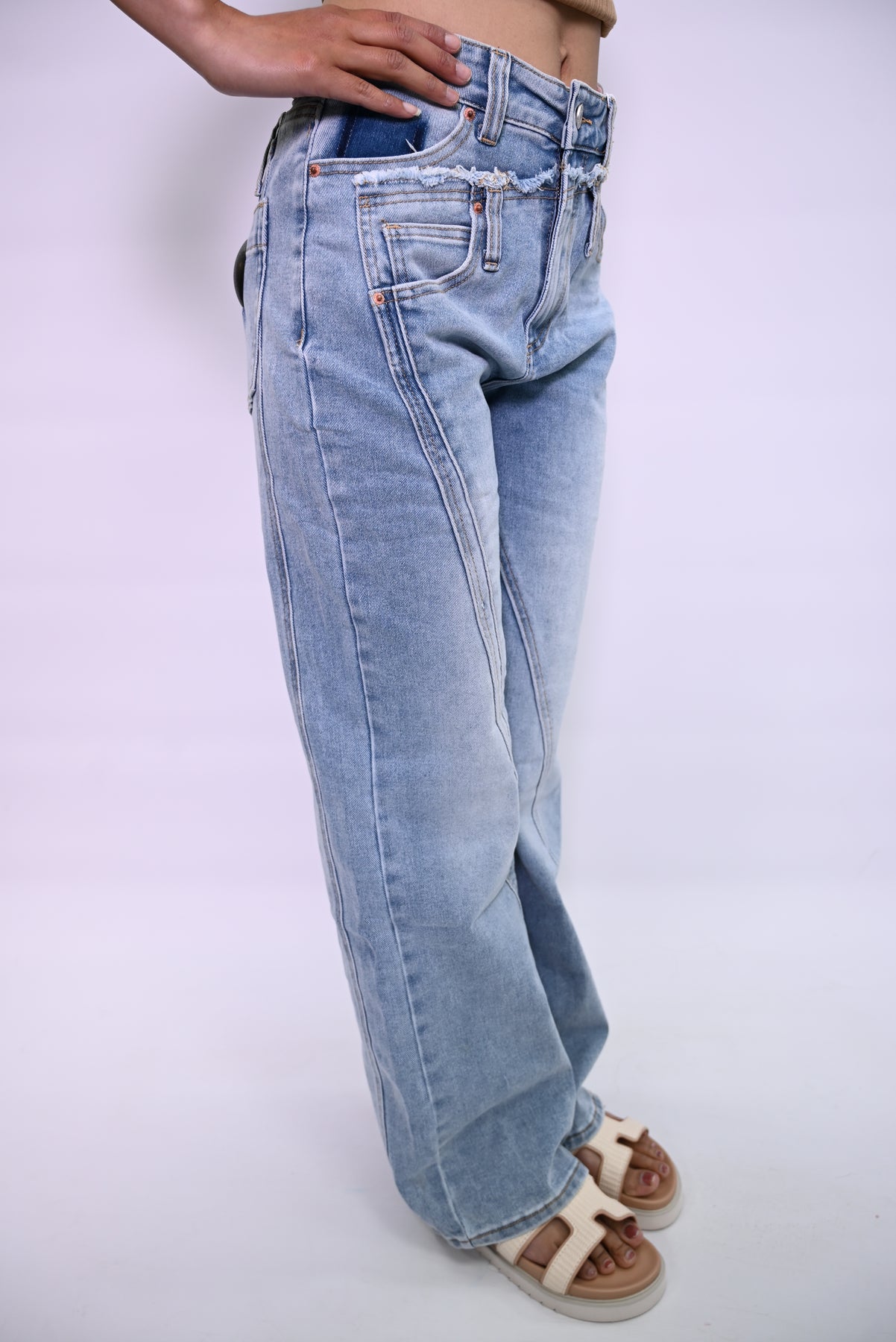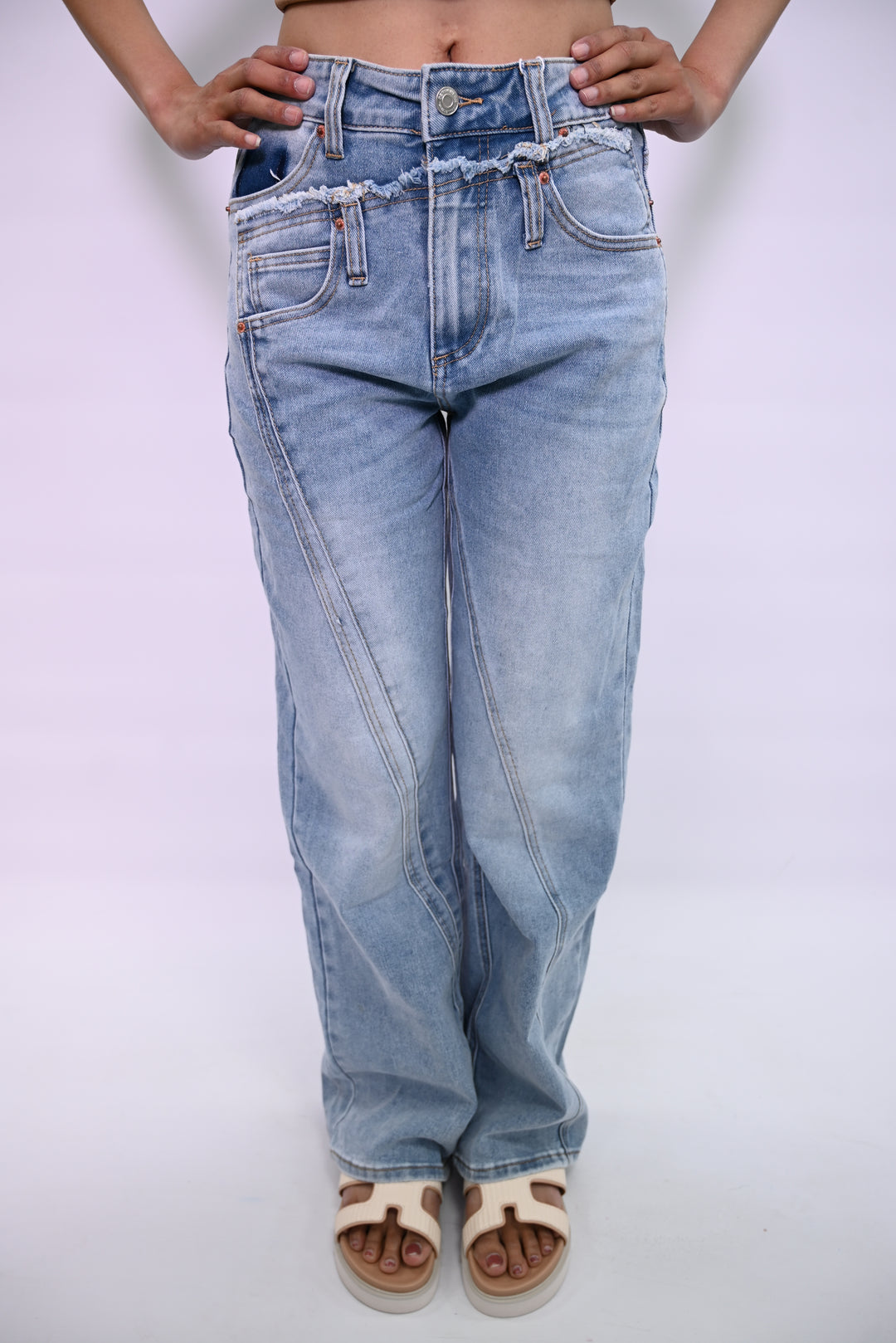Deze trendy lichtblauwe denim jeans heeft een unieke gerafelde tailleband voor een speelse en edgy uitstraling. De broek is voorzien van meerdere zakken, waaronder twee voorzakken en een kleine muntzak, en heeft opvallende stikseldetails langs de benen. Dankzij de relaxte pasvorm en lichte wassing is deze jeans perfect voor casual en stijlvolle combinaties. Draag hem met sandalen en een luchtige blouse voor een moeiteloze look.