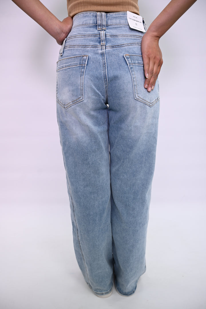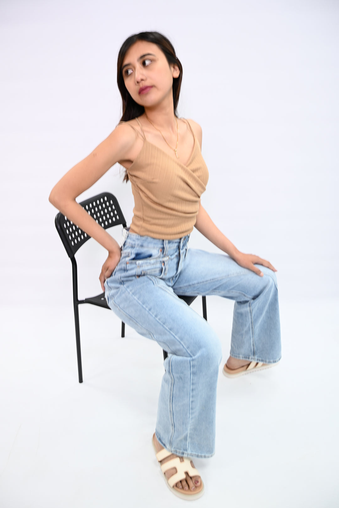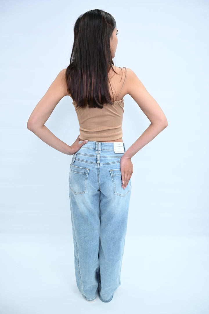 Deze trendy lichtblauwe denim jeans heeft een unieke gerafelde tailleband voor een speelse en edgy uitstraling. De broek is voorzien van meerdere zakken, waaronder twee voorzakken en een kleine muntzak, en heeft opvallende stikseldetails langs de benen. Dankzij de relaxte pasvorm en lichte wassing is deze jeans perfect voor casual en stijlvolle combinaties. Draag hem met sandalen en een luchtige blouse voor een moeiteloze look.